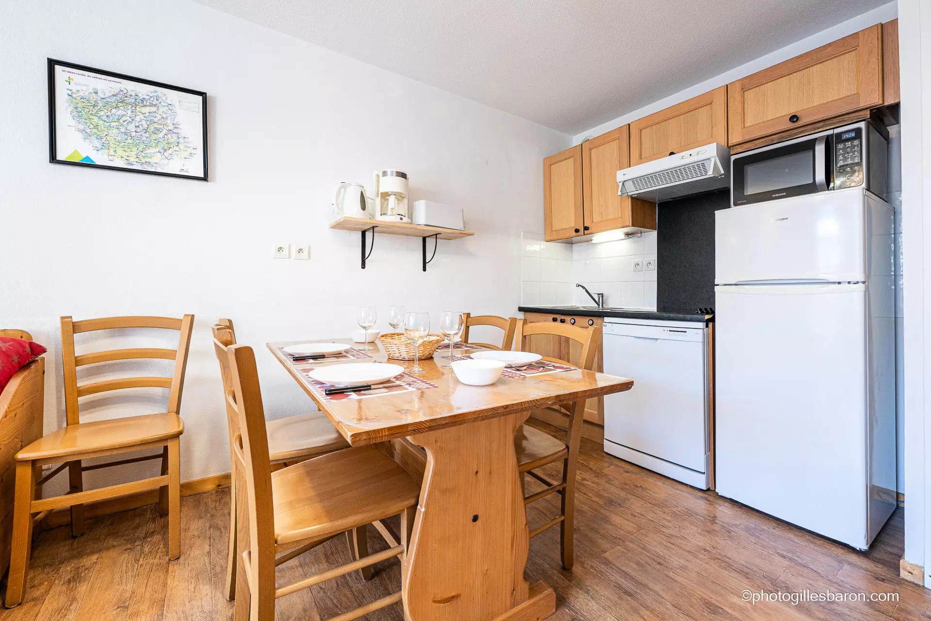 Coin cuisine : 4 plaques vitrocéramiques, frigo/congélateur, micro-ondes, lave-vaisselle.