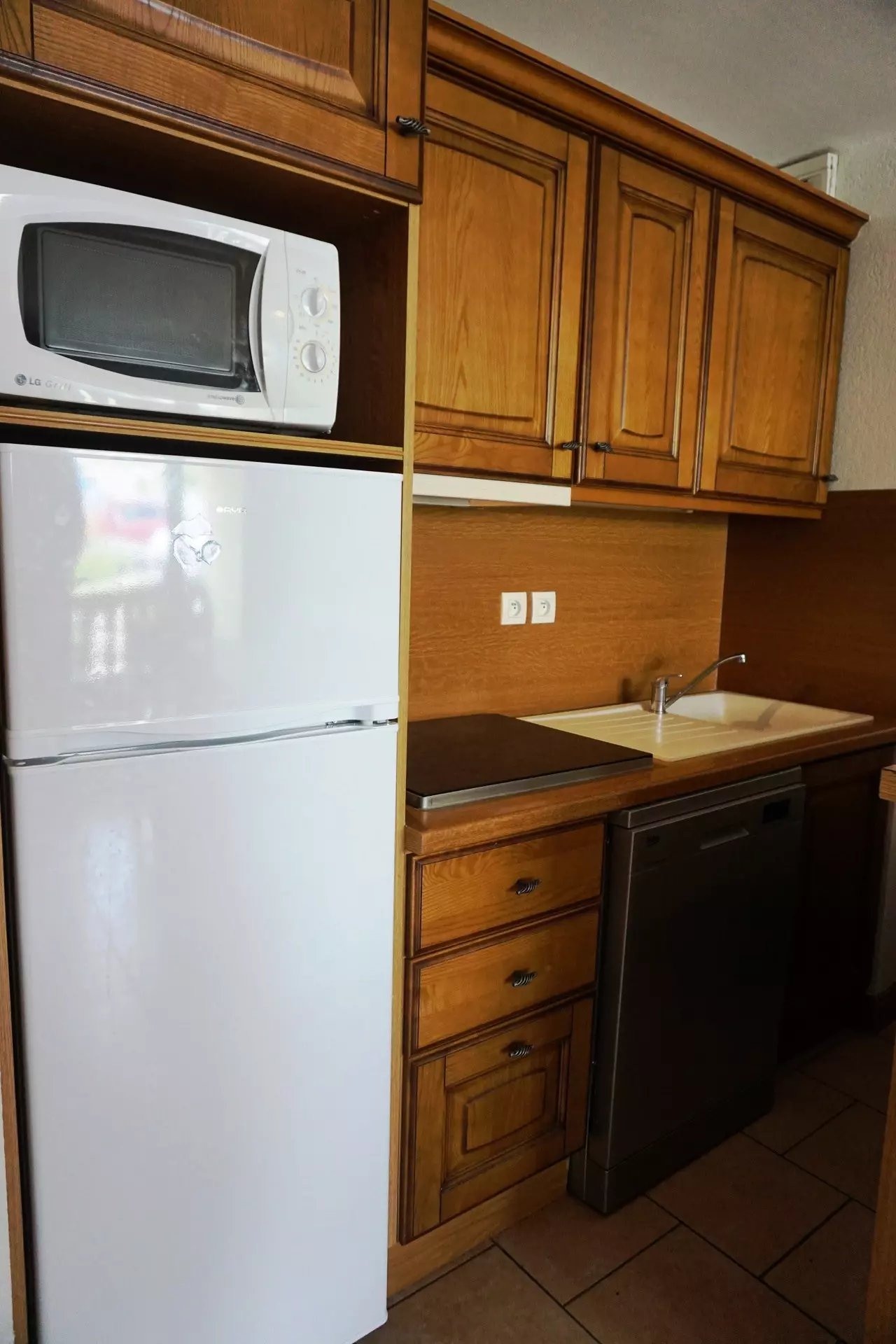 Kitchenette comprenant : 4 plaques vitrocéramiques, frigo, combiné micro-ondes grill, lave-vaisselle.