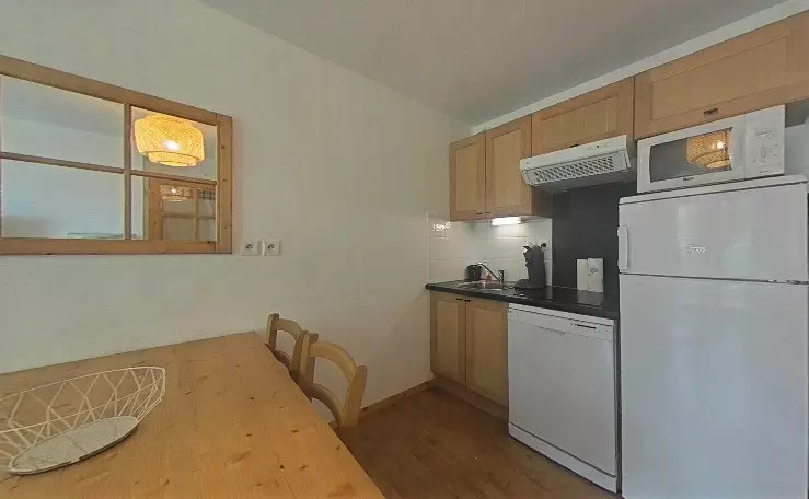 Coin cuisine : 4 plaques vitrocéramiques, frigo/congélateur, micro-ondes, lave-vaisselle.