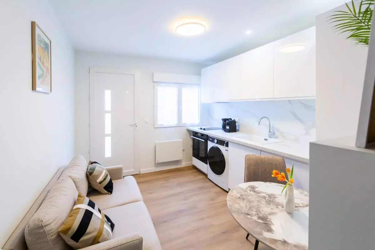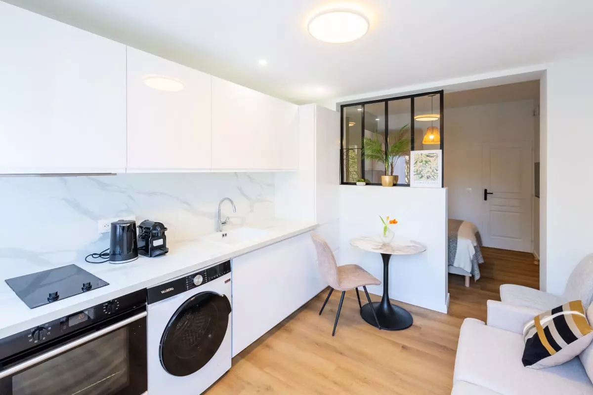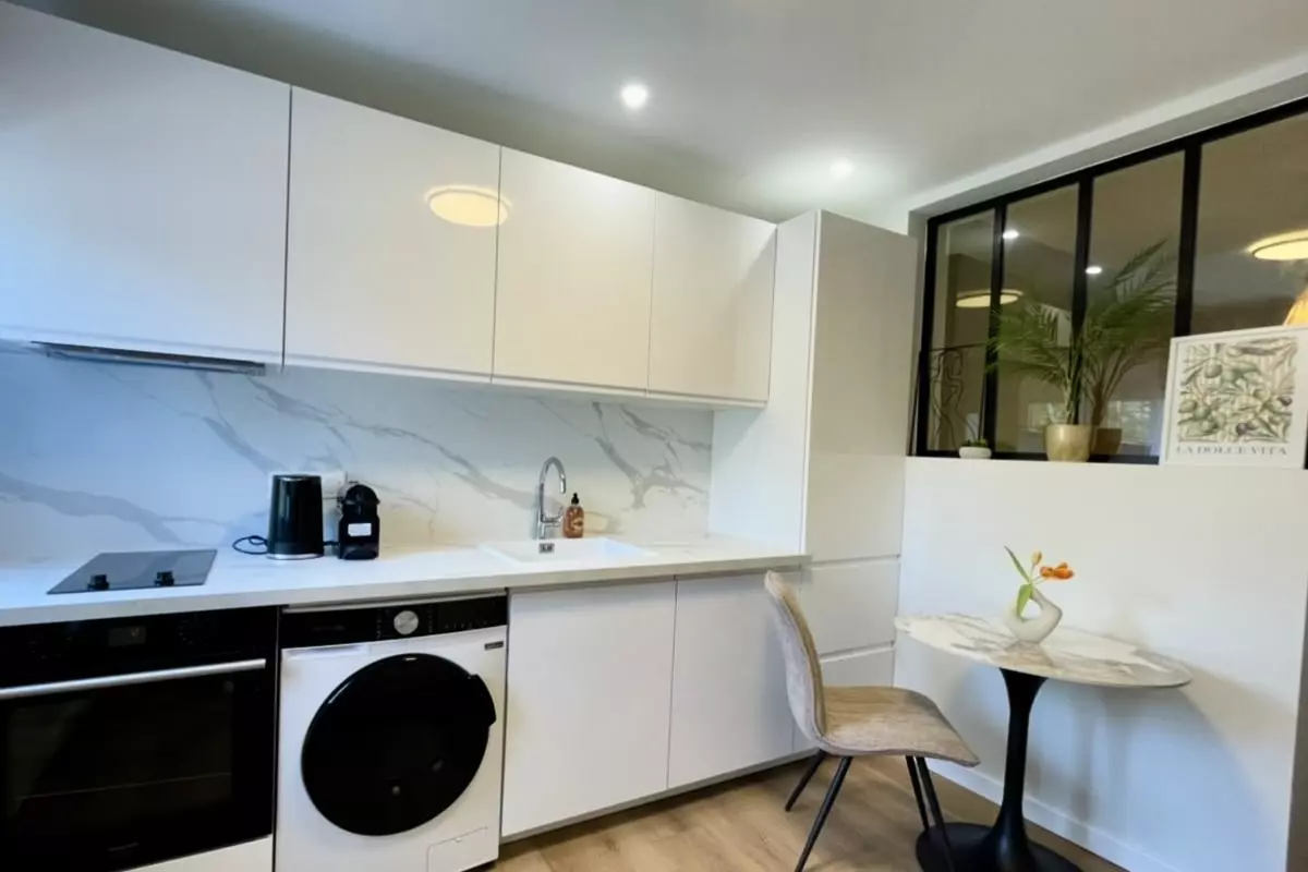 - Cuisine : Ouverte et entièrement équipée (micro-ondes, plaques de cuisson, four, bouilloire, grille-pain, machine à café, réfrigérateur, lave-linge et tous les ustensiles indispensables).