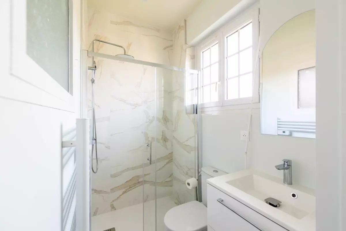- Salle d'eau : Moderne et raffinée, avec douche, lavabo et sèche-cheveux.