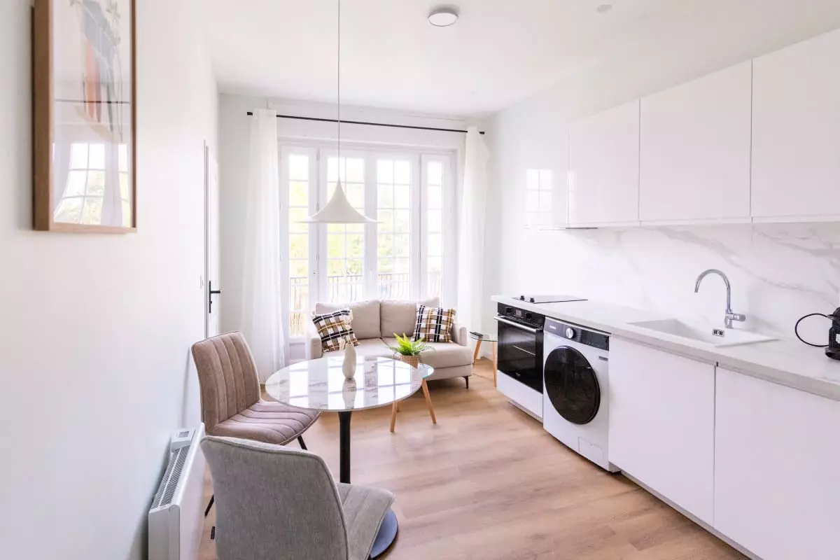 - Cuisine : Ouverte et entièrement équipée (micro-ondes, plaques de cuisson, four, bouilloire, grille-pain, machine à café, réfrigérateur, lave-linge et tous les ustensiles indispensables).