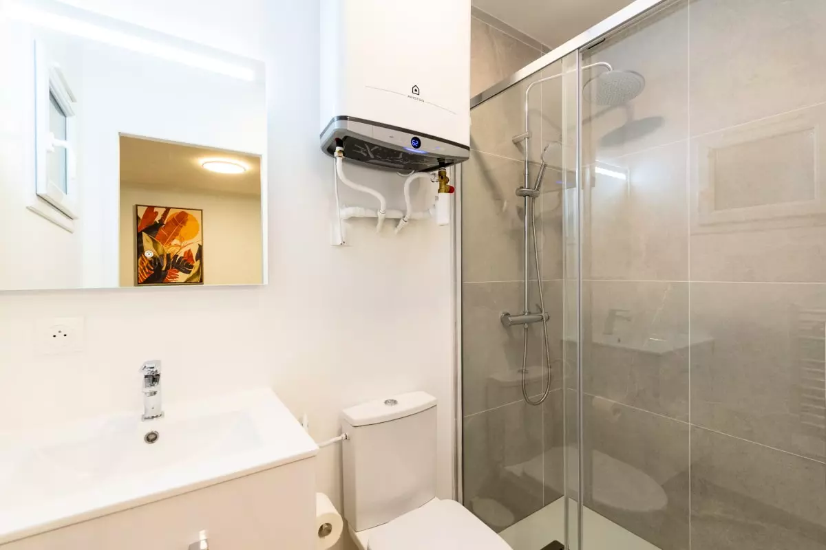 - Salle d'eau : Moderne et raffinée, avec douche, lavabo et sèche-cheveux.
