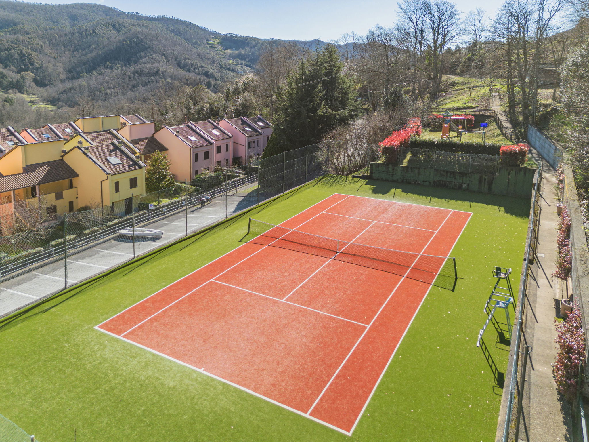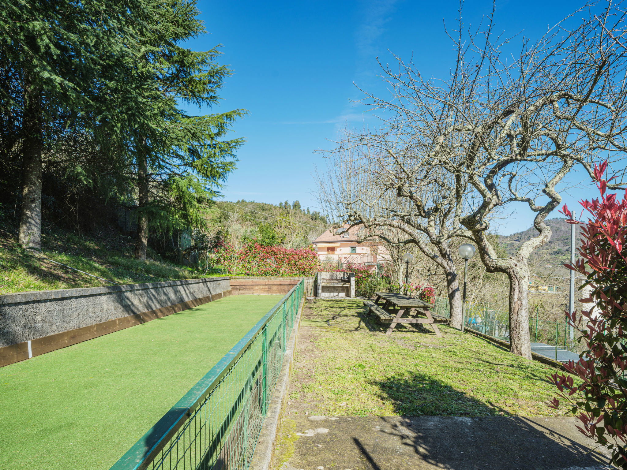 Grande résidence "Villaggio 5 Terre", 460 m au dessus du niveau de la mer, environnée par les arbres. Dans le hameau de Puin, à 6 km du centre de Pignone, à 11 km du centre de Levanto, situation tranquille, surélevée, à 9 km de la mer, à 9 km de la plage. En commun: parc (clôturé), piscine rectangulaire (400 m2, profondeur 170 - 220 cm, disponibilité saisonnière: 15.Jun. - 15.Sep. horaires d'ouverture de la piscine: 09:30-19:30). Bassin pour les enfants, douche extérieure, tennis, ping-pong, terrain de pétanque, espace barbecue, espace de jeux pour les enfants, entretien de la piscine par le propriétaire/jardinier. Infrastructures de la Maison: chauffage central, chauffage payable localement (22.Mar. - 31.Oct.), possibilité de chauffage uniquement du 01.Nov. - 21.Mar.. Place de parking sur le terrain. Magasin d'alimentation 6 km, supermarché 6 km, centre commercial 22 km, restaurant, arrêt de bus 100 m, gare ferroviaire "Monterosso / Levanto" 10 km, plage de sable 9 km. Attractions à proximité: Monterosso al Mare 9 km, Vernazza 10 km, Corniglia 13 km, La Spezia 22 km, Levanto 26 km, Riomaggiore 31 km. Région de randonnées: Parco Nazionale delle Cinque Terre. Veuillez noter: voiture recommandée. Adapté(e) aux familles. Le propriétaire n'accepte pas les groupes de jeunes. Environnement très sensible au bruit. Silence et bonne tenue exigés. Port du bonnet de bain obligatoire.