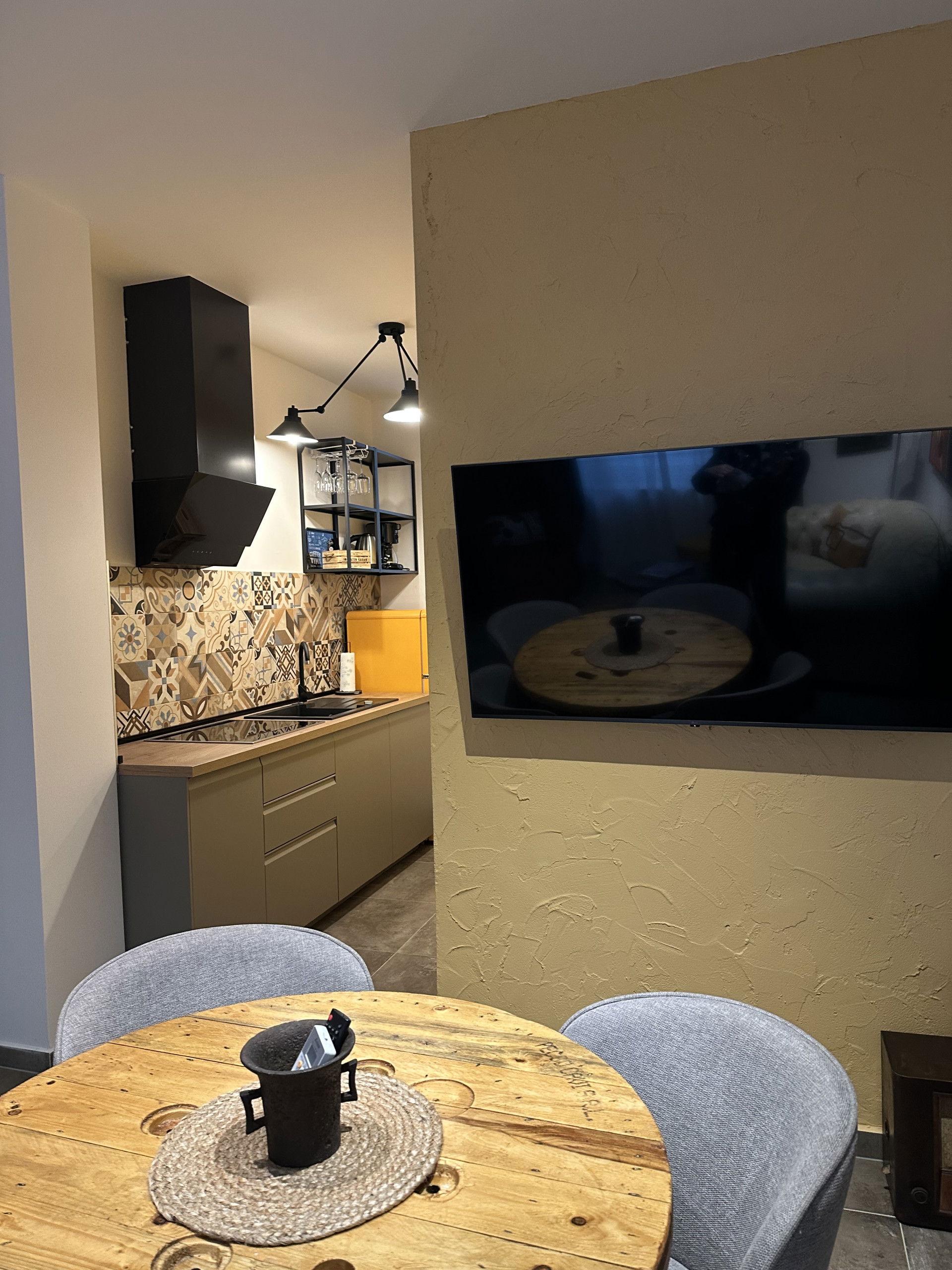 La cuisine américaine, à induction, est équipée avec réfrigérateur, micro-ondes, congélateur, lave-vaisselle, vaisselle/couverts, ustensiles/cuisine, cafetière, grille pain et bouilloire.