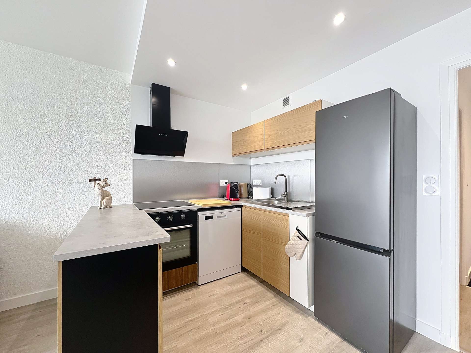 - une cuisine ouverte et équipée (réfrigérateur - congélateur, plaque de cuisson à induction, hotte, four, lave-vaisselle, cafetière, bouilloire, grille-pain),