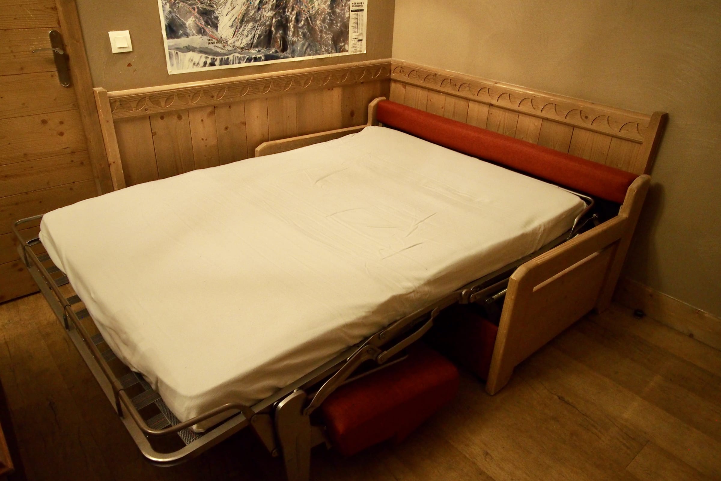 - Séjour avec canapé-lit et coin montagne avec lits superposés triples