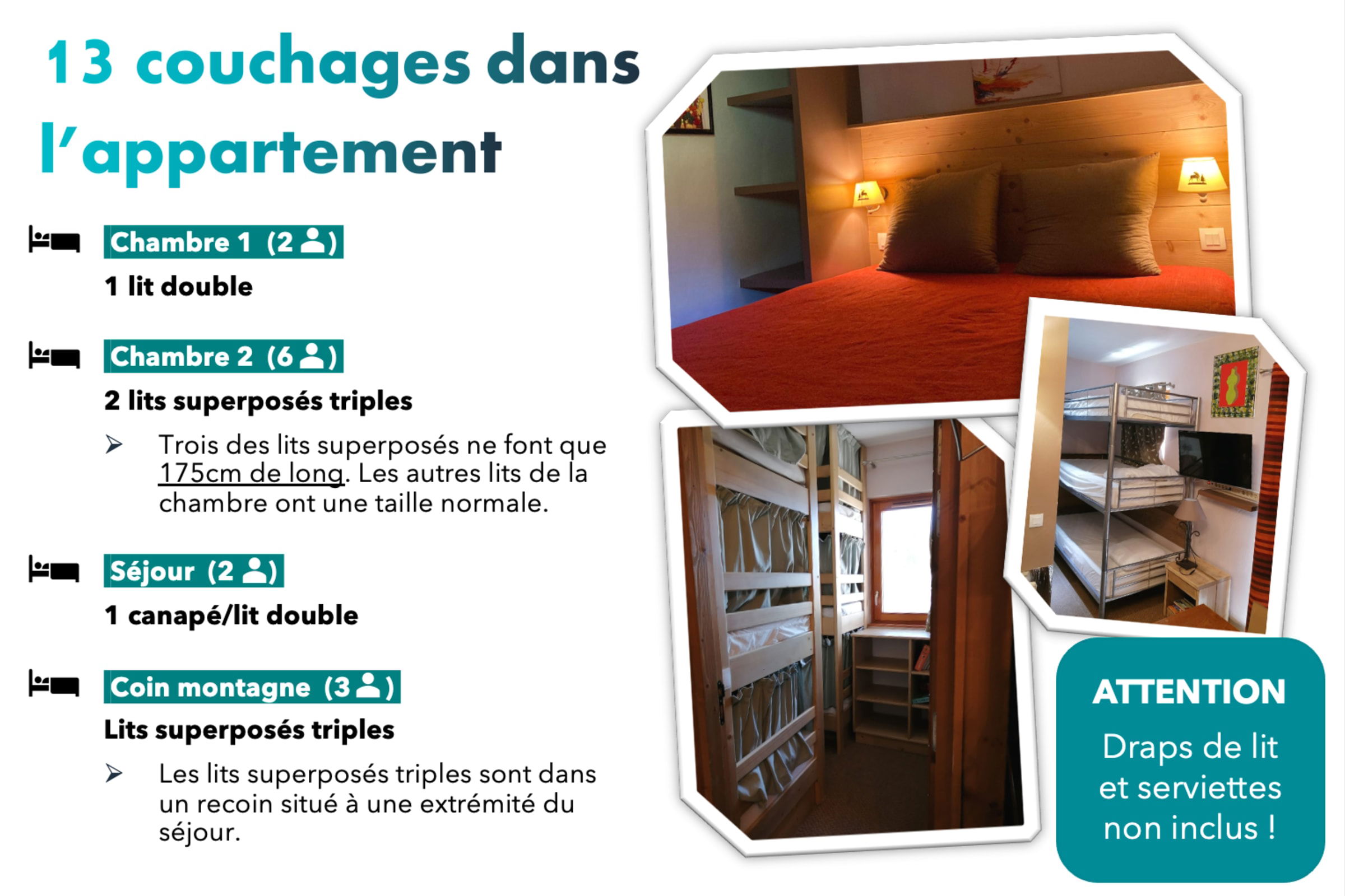 Attention: L'un des lits superposés triples dans la chambre a des lits de 175cm de long ! Les autres couchages sont de taille normale.