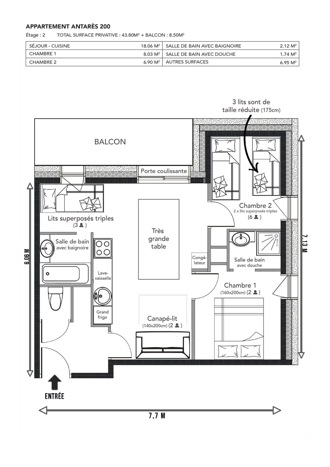 Le logement est situé au 2e étage de la résidence Antarès, le même que la piscine. Il est agencé de la façon suivante :