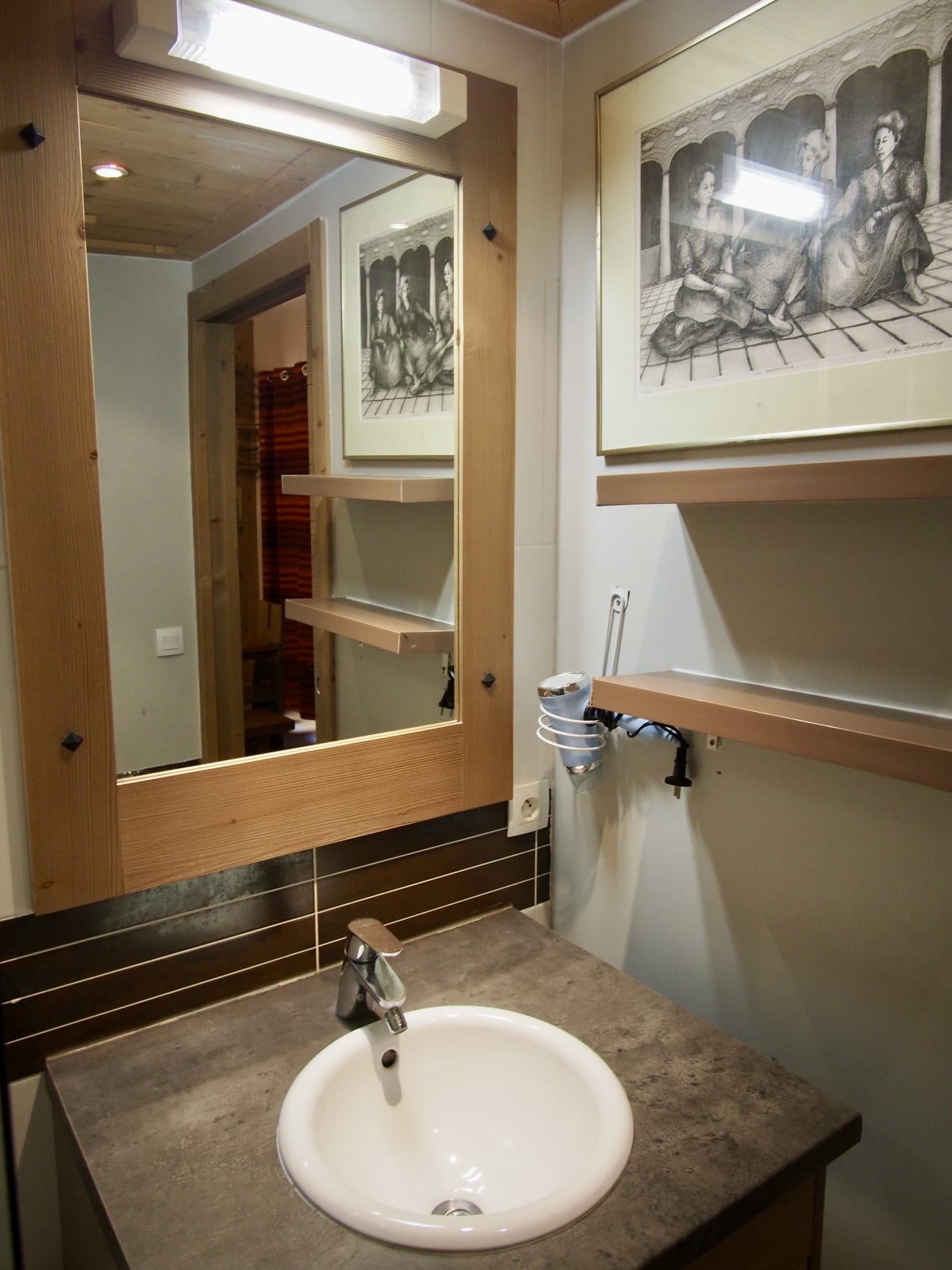 - Cuisine super équipée: un lave-vaisselle, un four à micro-ondes, un four classique, une cafetière à filtres, une bouilloire, un appareil à raclette/pierrade et à fondue, un grille-pain, un mixeur et un presse-agrumes. Mais aussi beaucoup de vaisselle : assiettes, verres, couverts, casseroles, poêles...