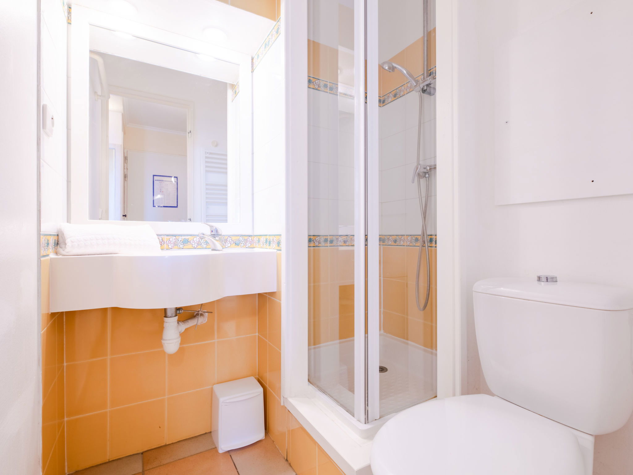Appartement de 3 pièces 45 m2 au 3ème étage. Aménagement simple et fonctionnel: séjour/salle à manger avec 1 divan-lit double (1 x 140 cm, longueur 190 cm), TV. Sortie sur la terrasse. 1 chambre avec 1 grand-lit (140 cm, longueur 190 cm). 1 chambre avec 1 x 2 lits superposés (80 cm, longueur 190 cm). Coin cuisine (lave-vaisselle, 4 plaques vitrocéramiques, grille-pain, bouilloire électrique, micro-ondes, cafetière électrique). Salle de bains, douche/WC. Chauffage électrique. Terrasse 8 m2, situation sud. Très belle vue sur la mer. A disposition: lave-linge. Internet (Connexion WIFI, en sus). Place de parking No 392. Veuillez noter: logement non-fumeur. 1 animal/ chien de petite taille autorisé. Détecteur de fumée, sans ascenseur. 83107000392NB