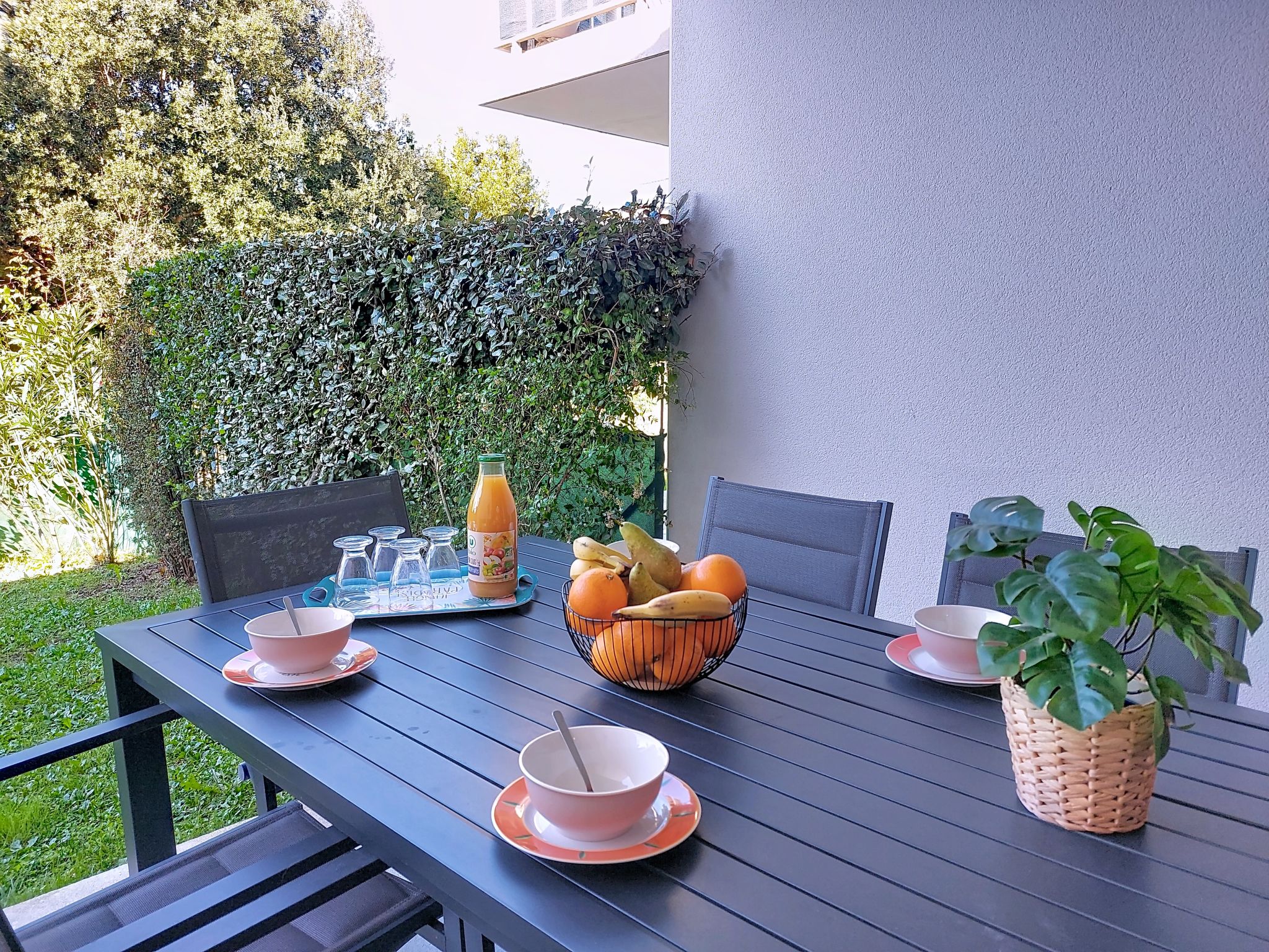 Appartement de 3 pièces 56 m2, au rez-de-chaussée, situation sud-ouest. Aménagement agréable: séjour avec TV (écran plat). Sortie sur la terrasse, sur le jardinet. 1 chambre avec 1 grand-lit (1 x 160 cm, longueur 190 cm). 1 chambre avec 1 lit gigogne (2 pers. 2 x 80 cm, longueur 190 cm). Coin cuisine (mini-four, lave-vaisselle, 4 plaques vitrocéramiques, grille-pain, bouilloire électrique, micro-ondes, congélateur, cafetière électrique). Douche, WC séparé. Chauffage au gaz. Terrasse 8 m2, situation sud-ouest, jardinet 45 m2. Meubles de terrasse, barbecue. A disposition: lave-linge. Internet (Connexion WIFI, en sus). Place de parking No 14 (couvert). Veuillez noter: maximum 1 animal/ chien autorisé. Détecteur de fumée. L'appartement est dans une résidence sécurisée. Annonce d'un particulier (art 155, IV du CGI). 17306000507SU
