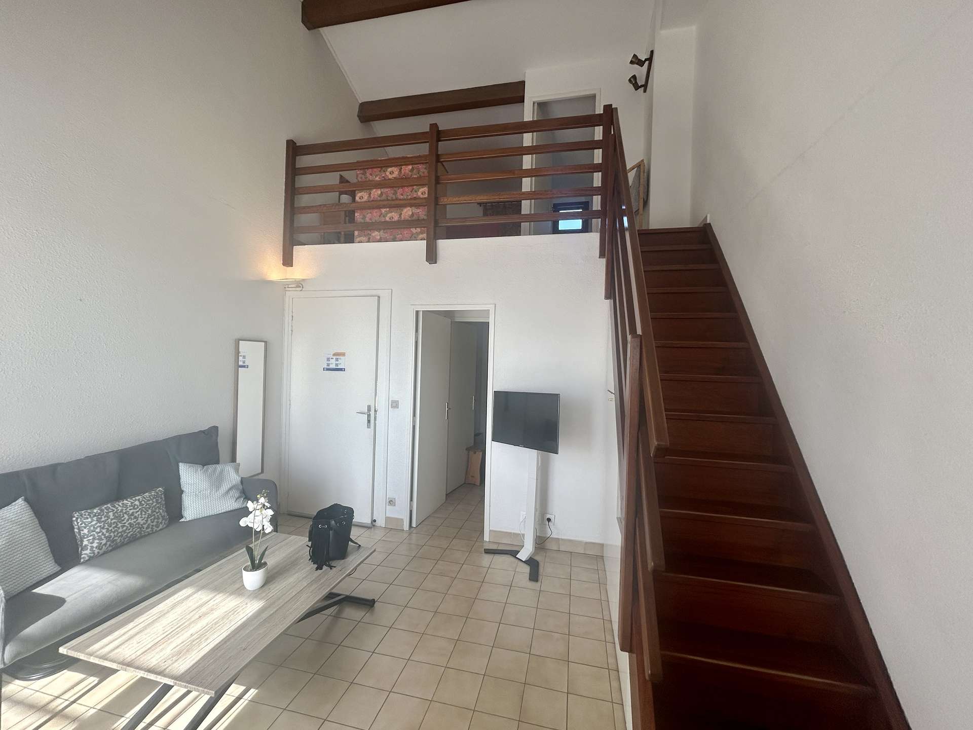 Cet appartement de vacances se compose d'un séjour avec terrasse et coin cuisine, une cabine avec deux lits superposés, un WC séparé, au niveau supérieur : une mezzanine avec un lit deux personnes, une salle d'eau avec WC.