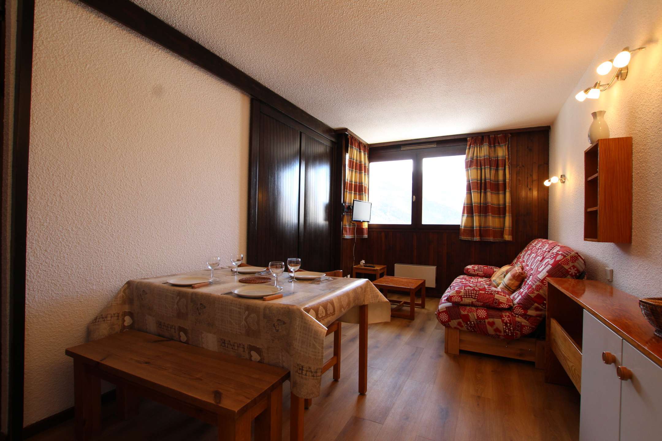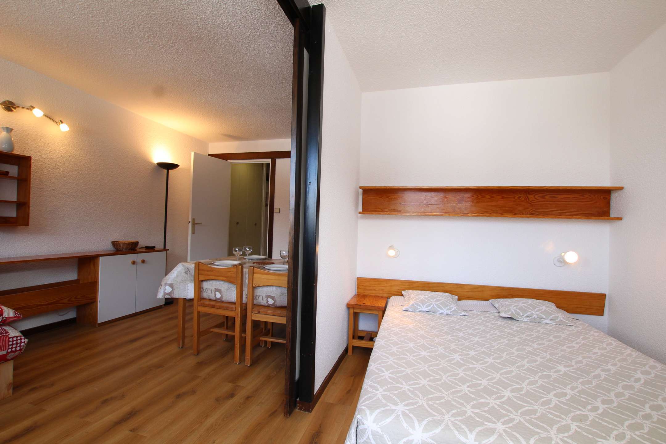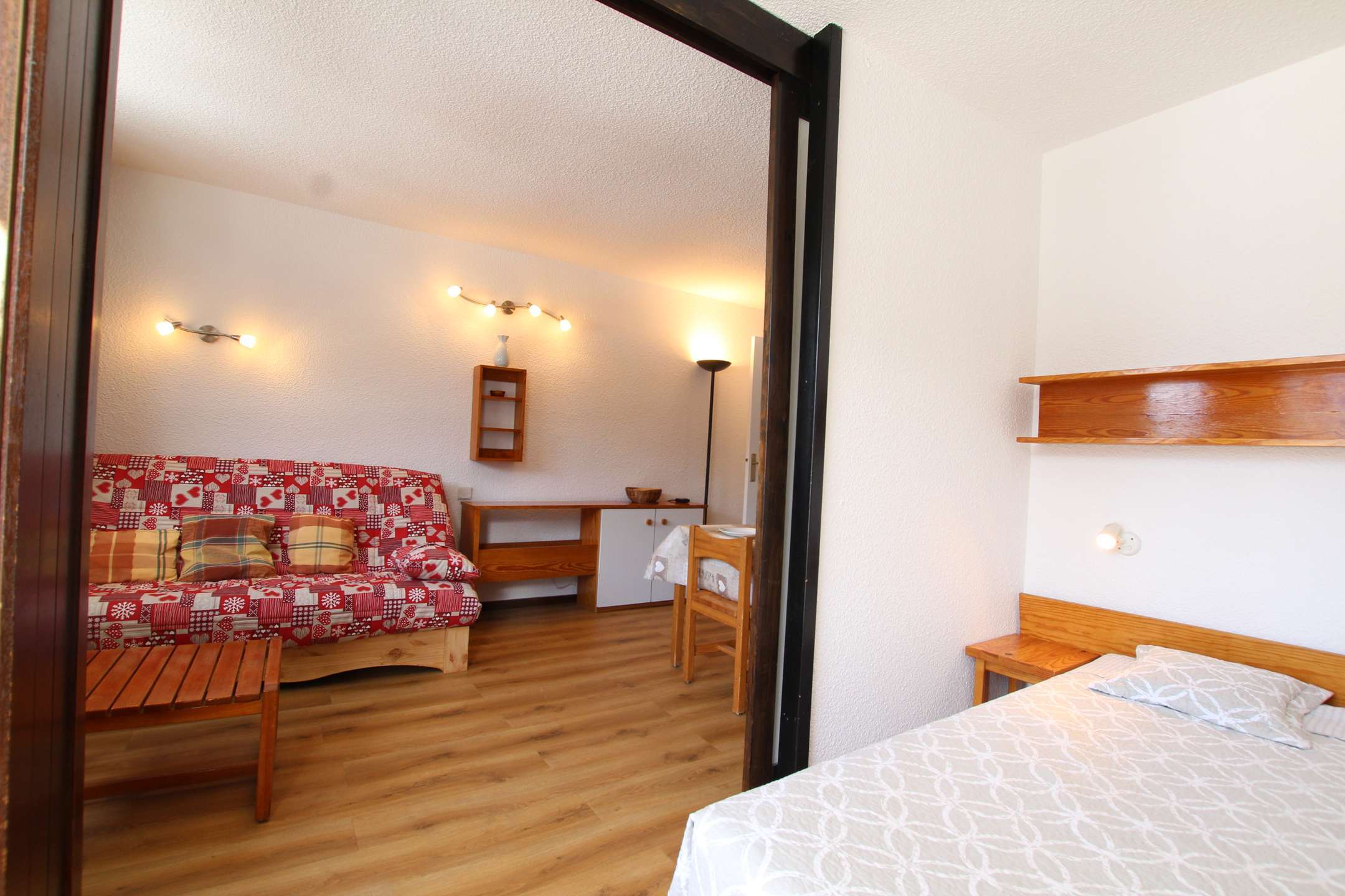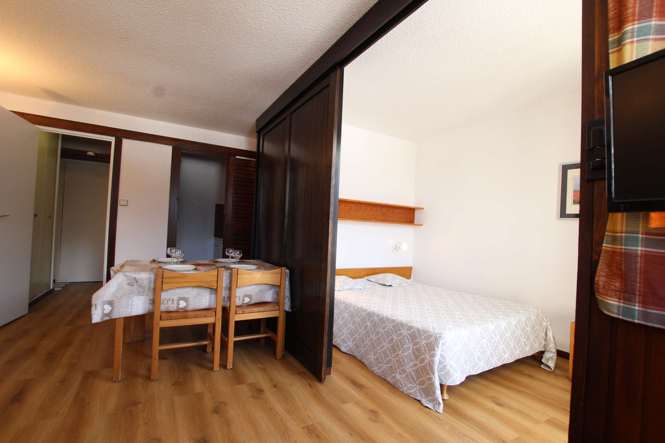Studio agréable pour 4 personnes avec un coin nuit fermé par une cloison coulissante (lit en 140), un séjour avec couchage pour deux personnes (canapé lit), + téléviseur.