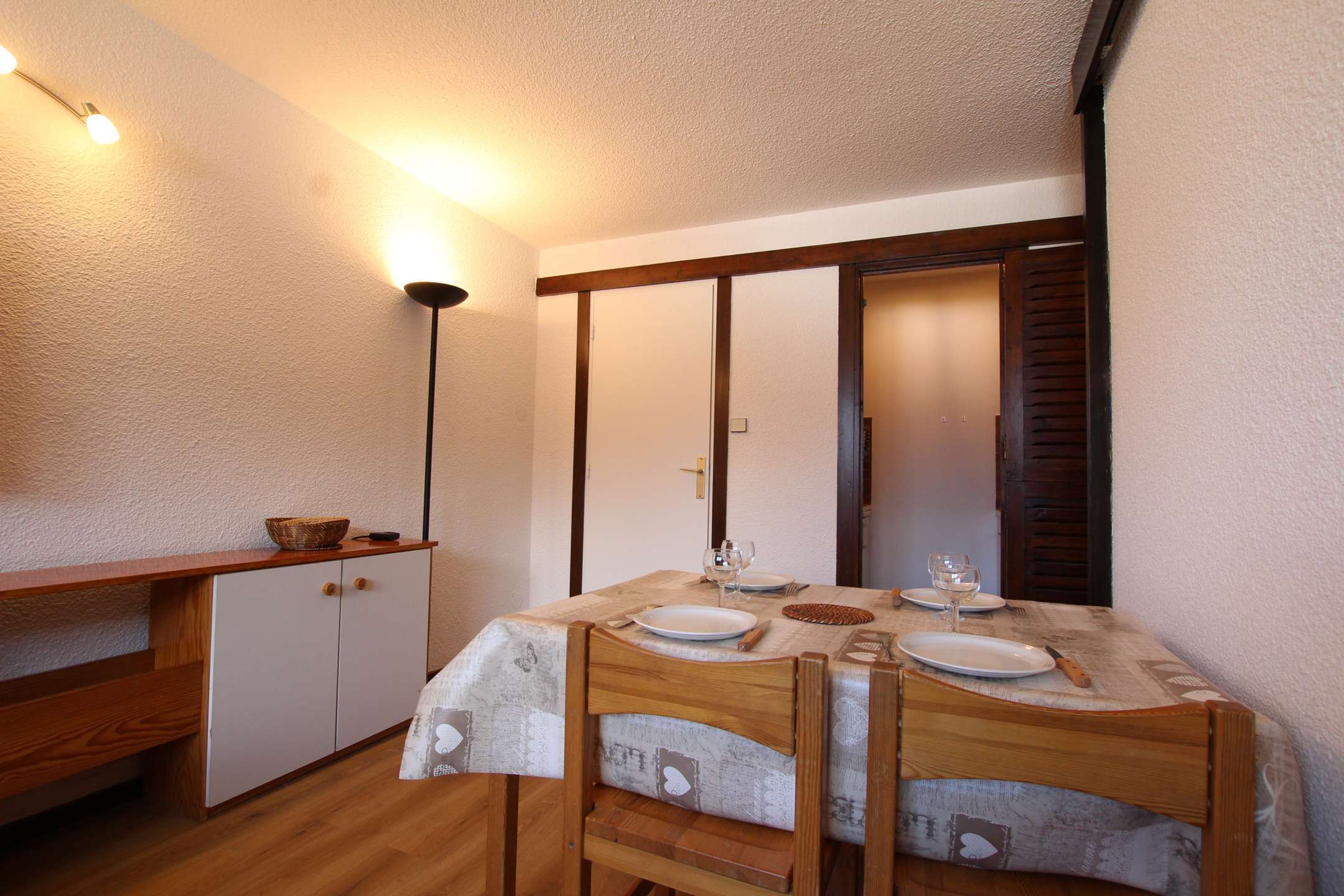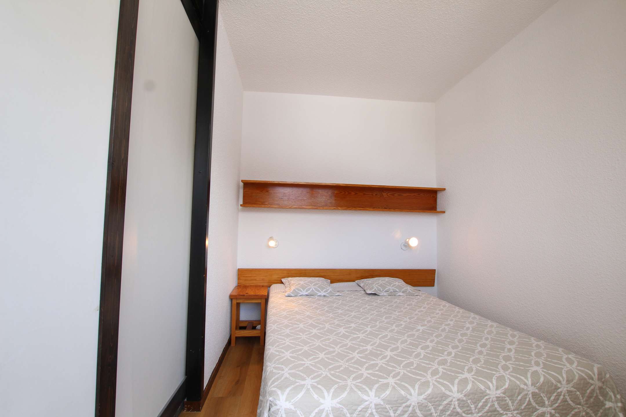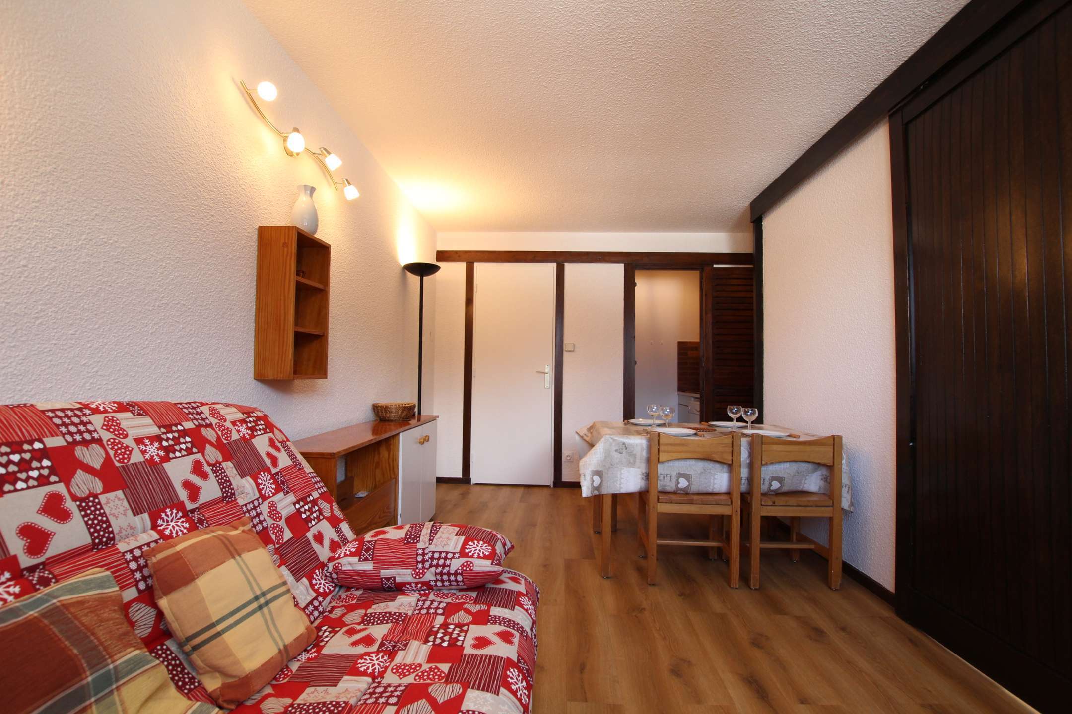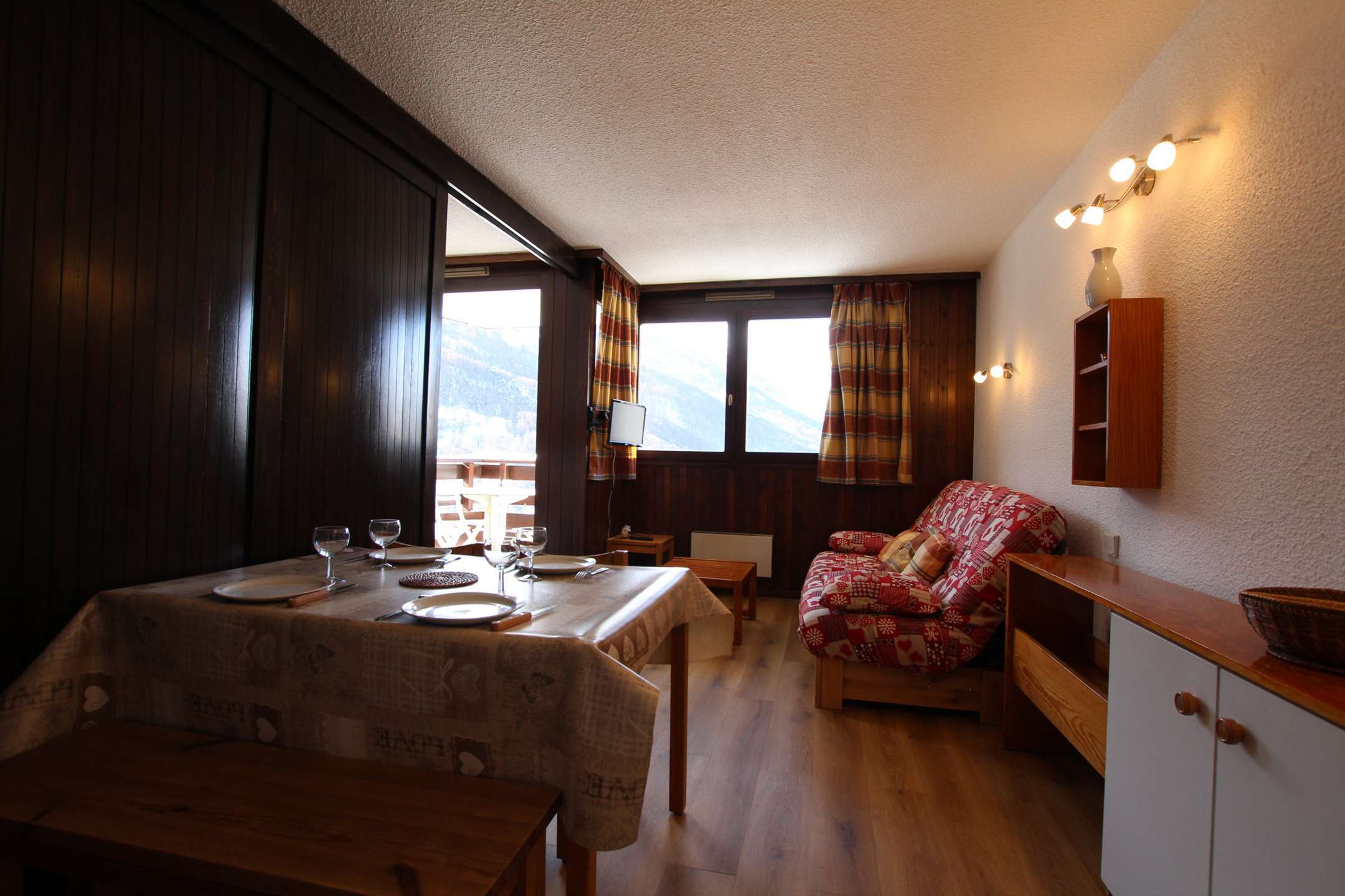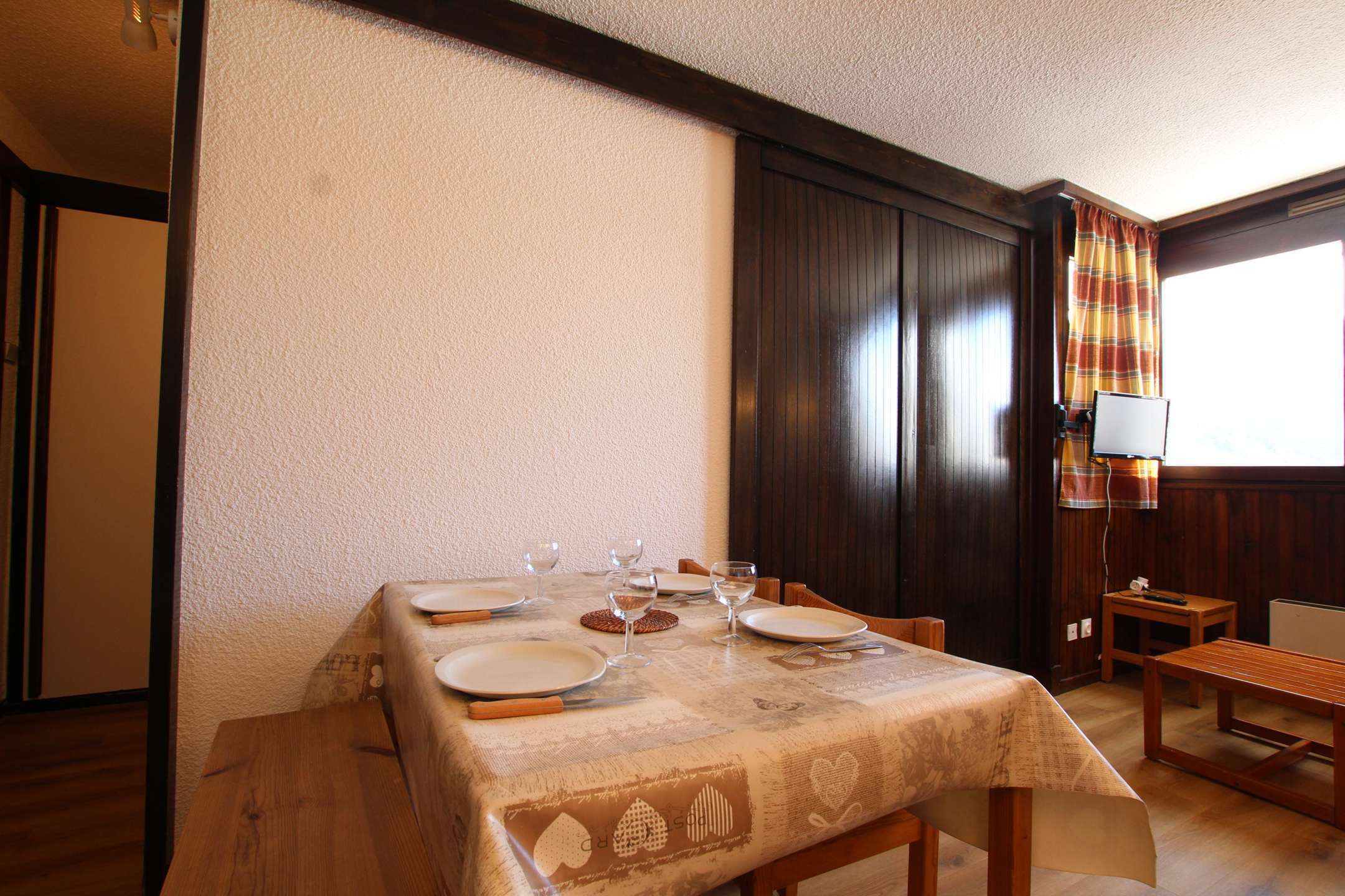 Studio agréable pour 4 personnes avec un coin nuit fermé par une cloison coulissante (lit en 140), un séjour avec couchage pour deux personnes (canapé lit), + téléviseur.