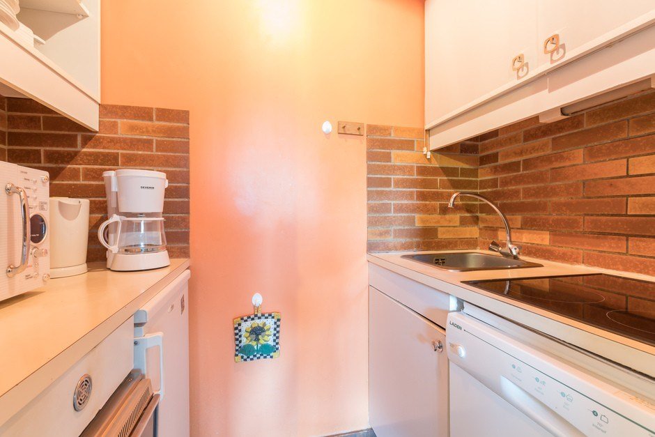 Une kitchenette équipée de frigo, lave-vaisselle, four, plaques vitro, micro-ondes, cafetière, bouilloire électrique, grille-pain, cocotte-minute