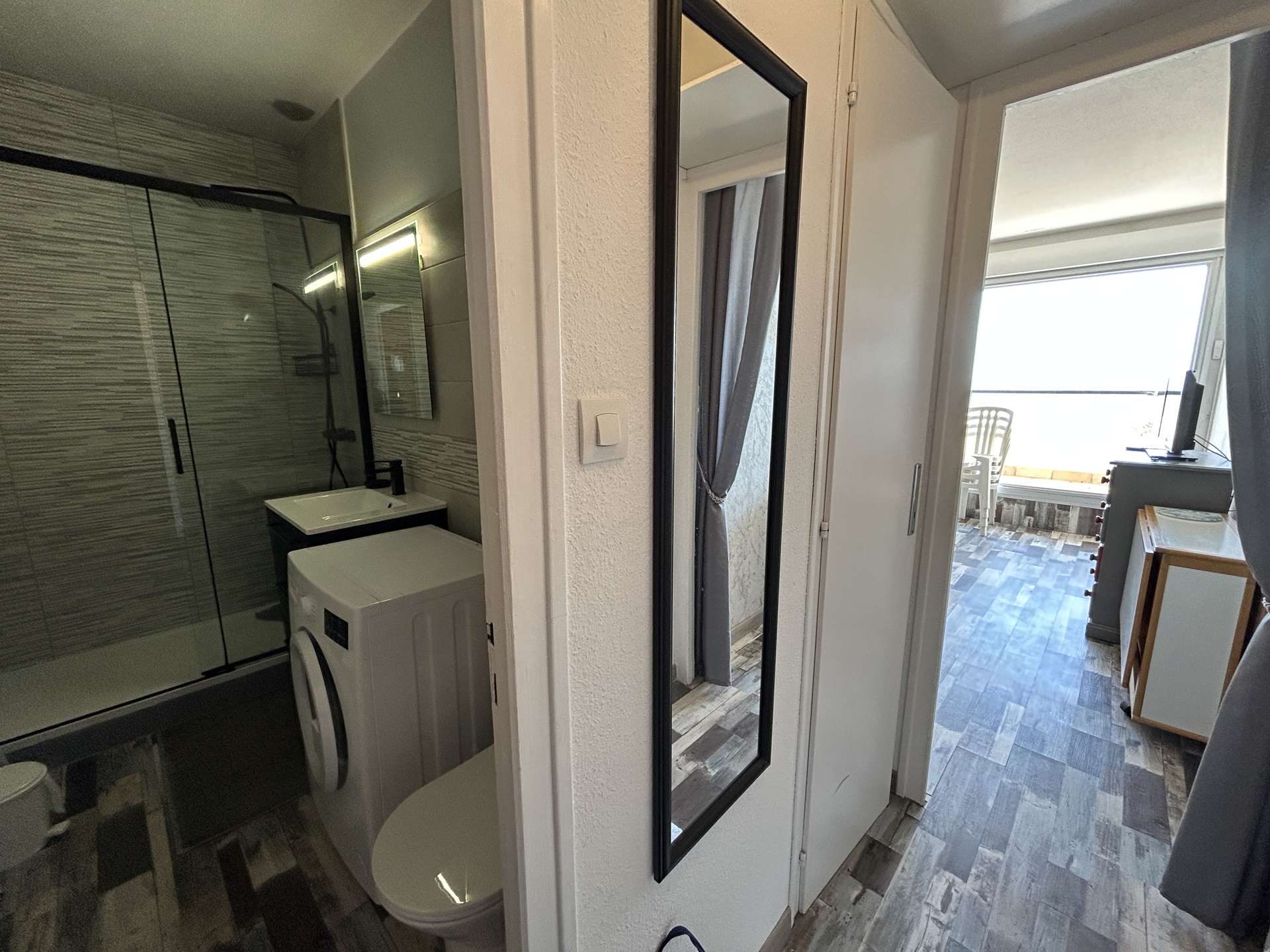 Cette location à la mer, située au 2ème étage propose un salon avec balcon vue mer, un canapé convertible deux places, un lit armoire une place, un coin cuisine équipé (micro-ondes, four, réfrigérateur, plaque de cuisson électrique), une salle de bains avec wc et lave linge.