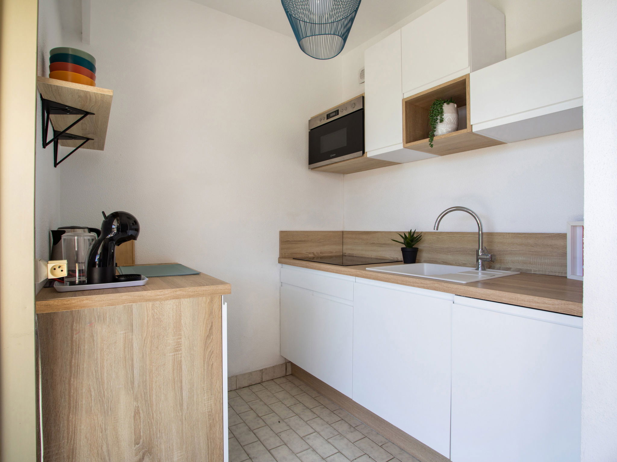 Studio 25 m2 au 3ème étage, situation sud-est. Clair, aménagement très agréable et plaisant: séjour/chambre à coucher avec baie vitrée avec 1 grand-lit (1 x 140 cm, longueur 190 cm), air-conditionné. Sortie sur le balcon. Petite cuisine (lave-vaisselle, 3 plaques à induction, grille-pain, bouilloire électrique, micro-ondes, cafetière électrique). Douche, WC séparé. Chauffage, chauffage électrique. Grand balcon 12 m2, situation sud et situation est. Meubles de terrasse. Vue latérale sur la mer et le port. A disposition: fer à repasser, sèche-cheveux. Internet (Connexion WIFI, gratuit). Place de parking (1 Voiture). Veuillez noter: logement non-fumeur. 1 animal/ chien de petite taille autorisé. Détecteur de fumée. Annonce d'un particulier (art 155, IV du CGI).