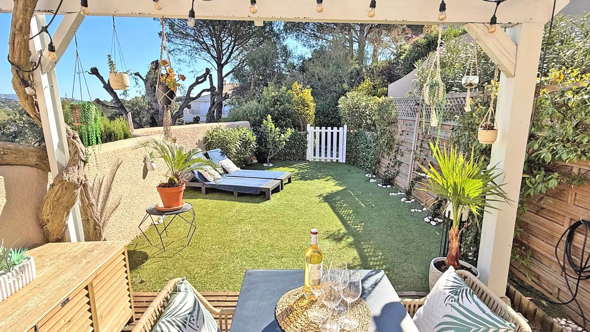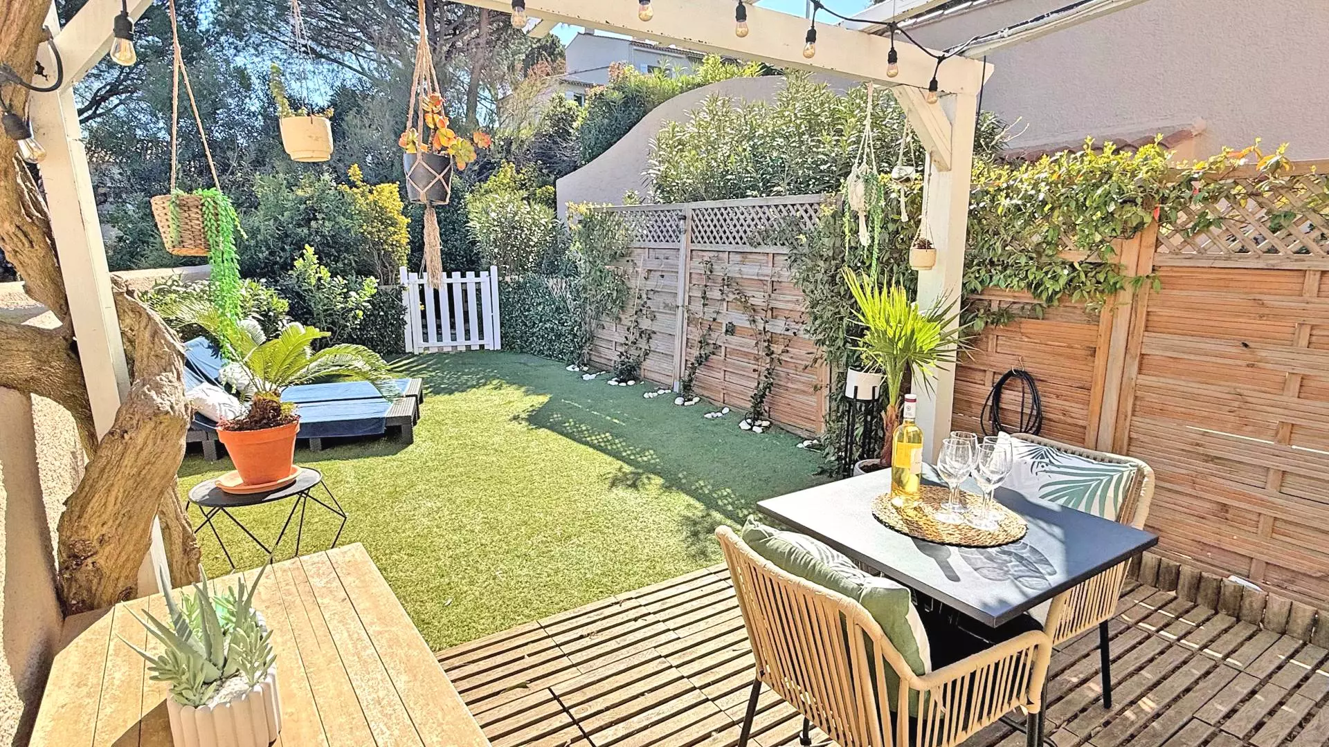 - Jardin privatif côté est (entrée) avec portillon et mobilier de repas et de détente