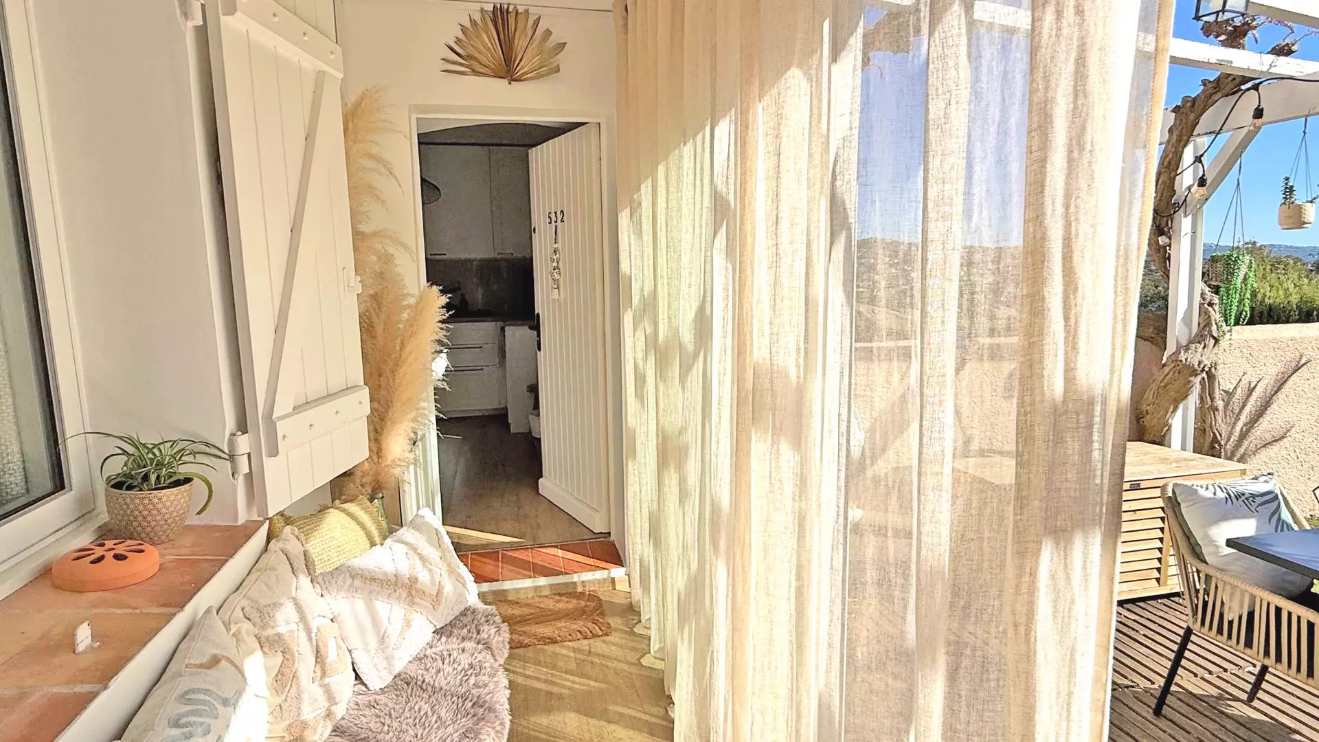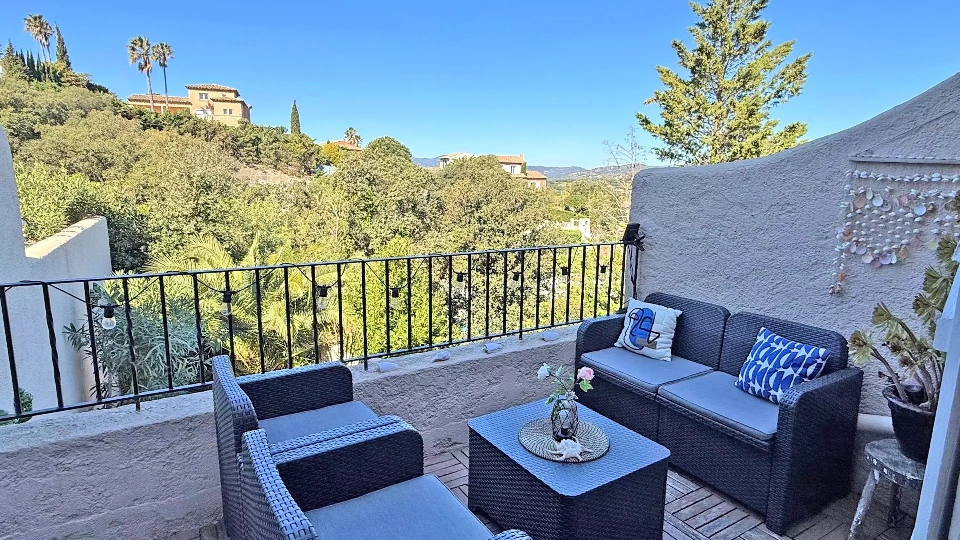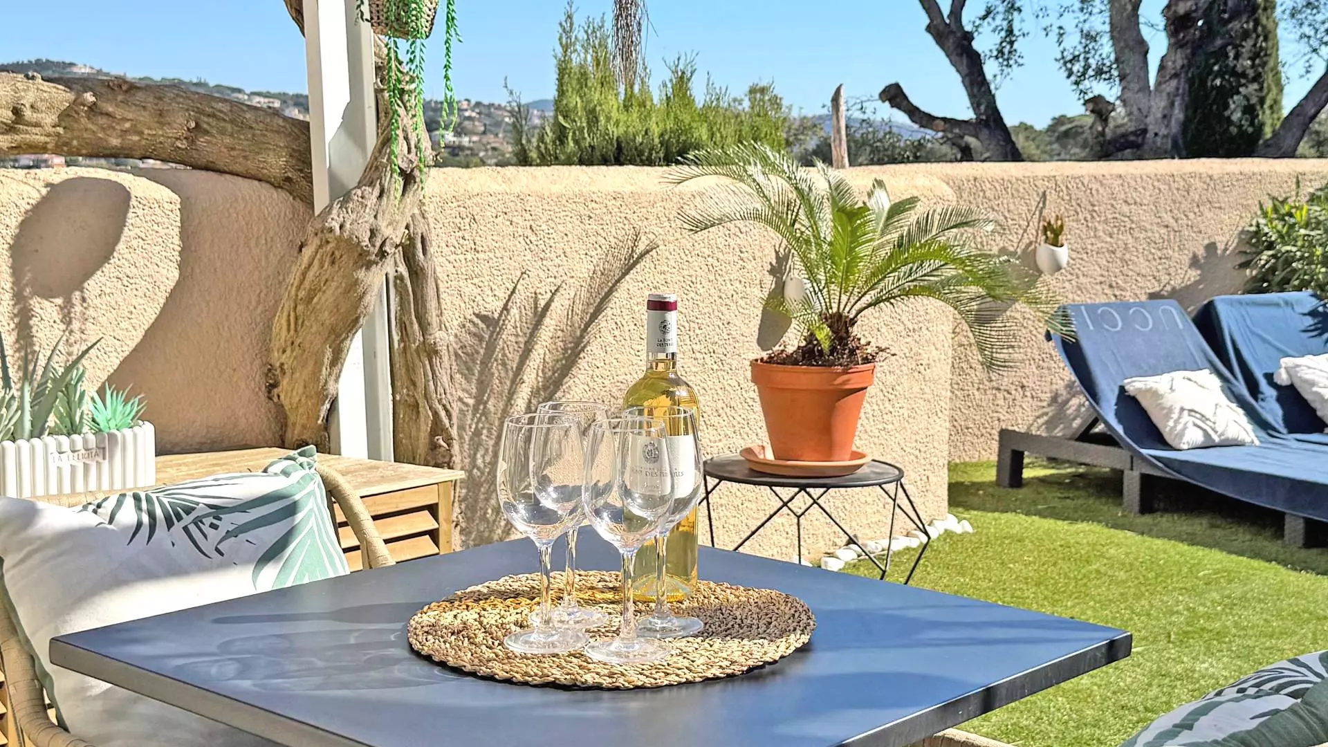 - Terrasse côté ouest avec vue sur les collines, mobilier de détente