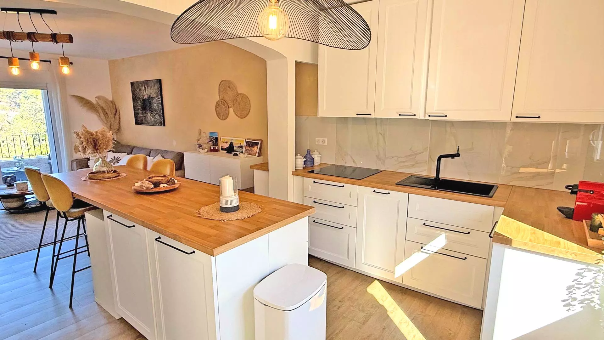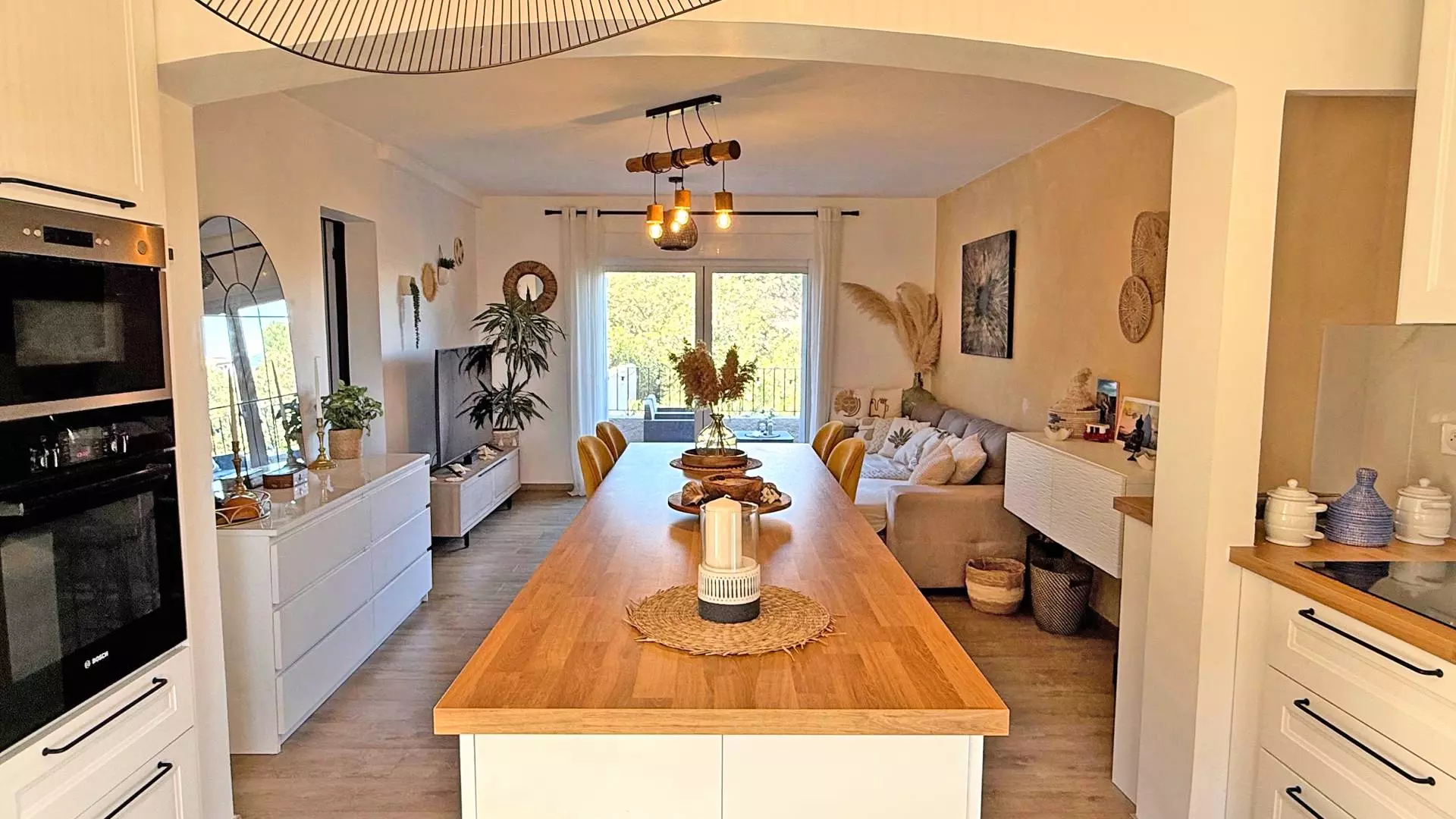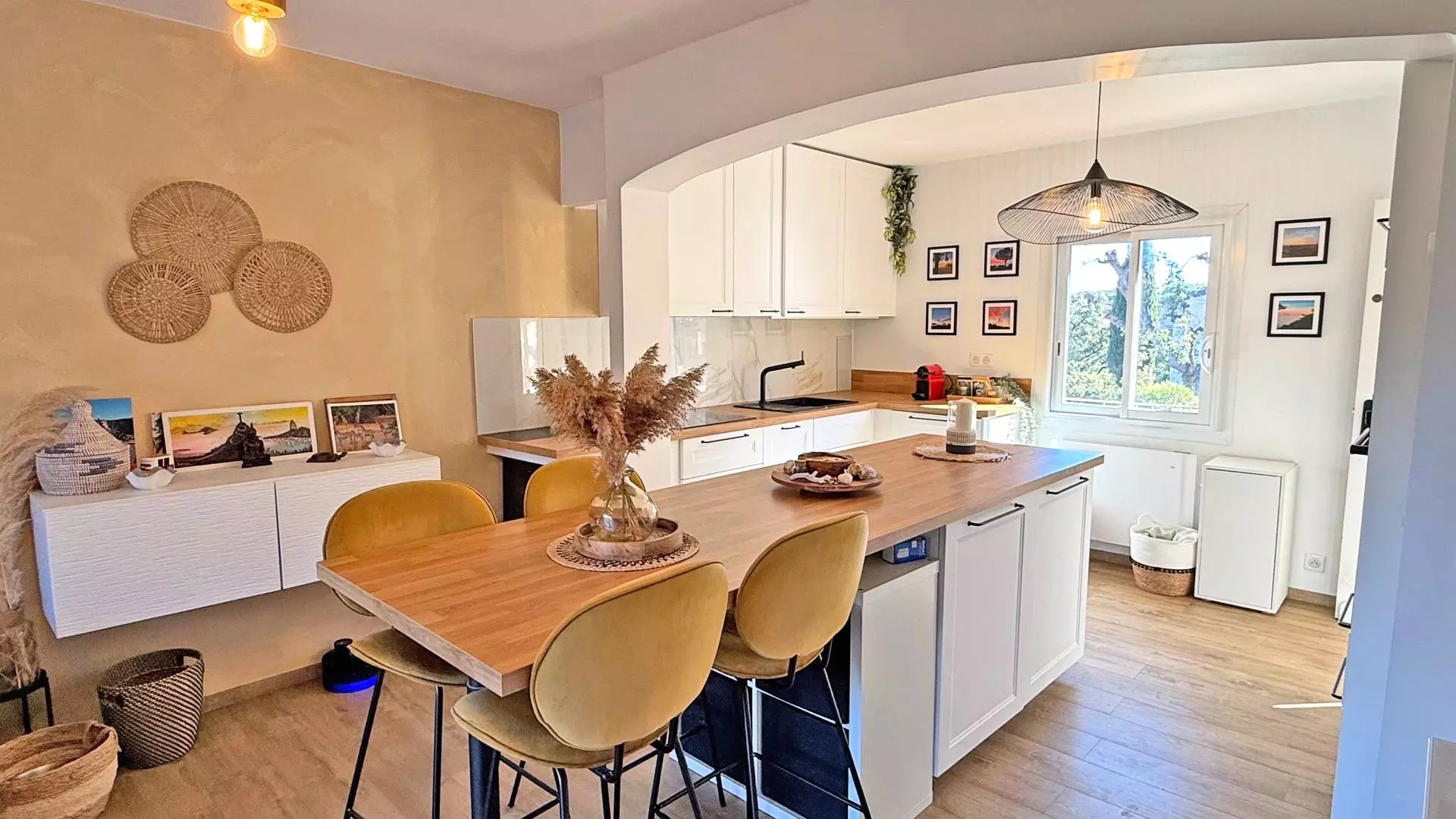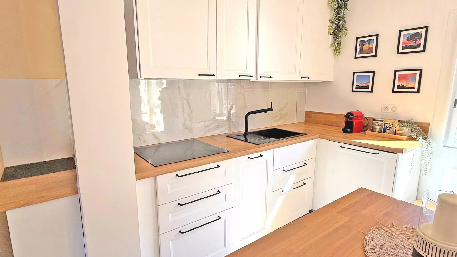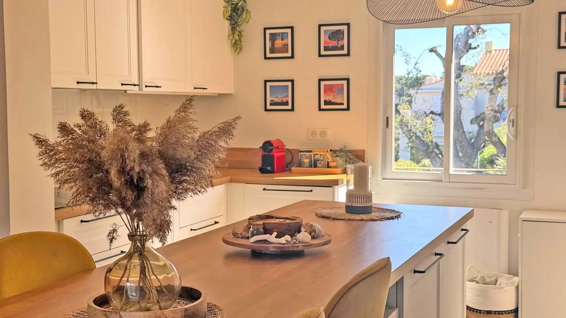- Cuisine ouverte et entièrement équipée (réfrigérateur, congélateur, four, micro-ondes, lave-vaisselle, machine à café Nespresso, bouilloire, vaisselles et ustensiles divers)
