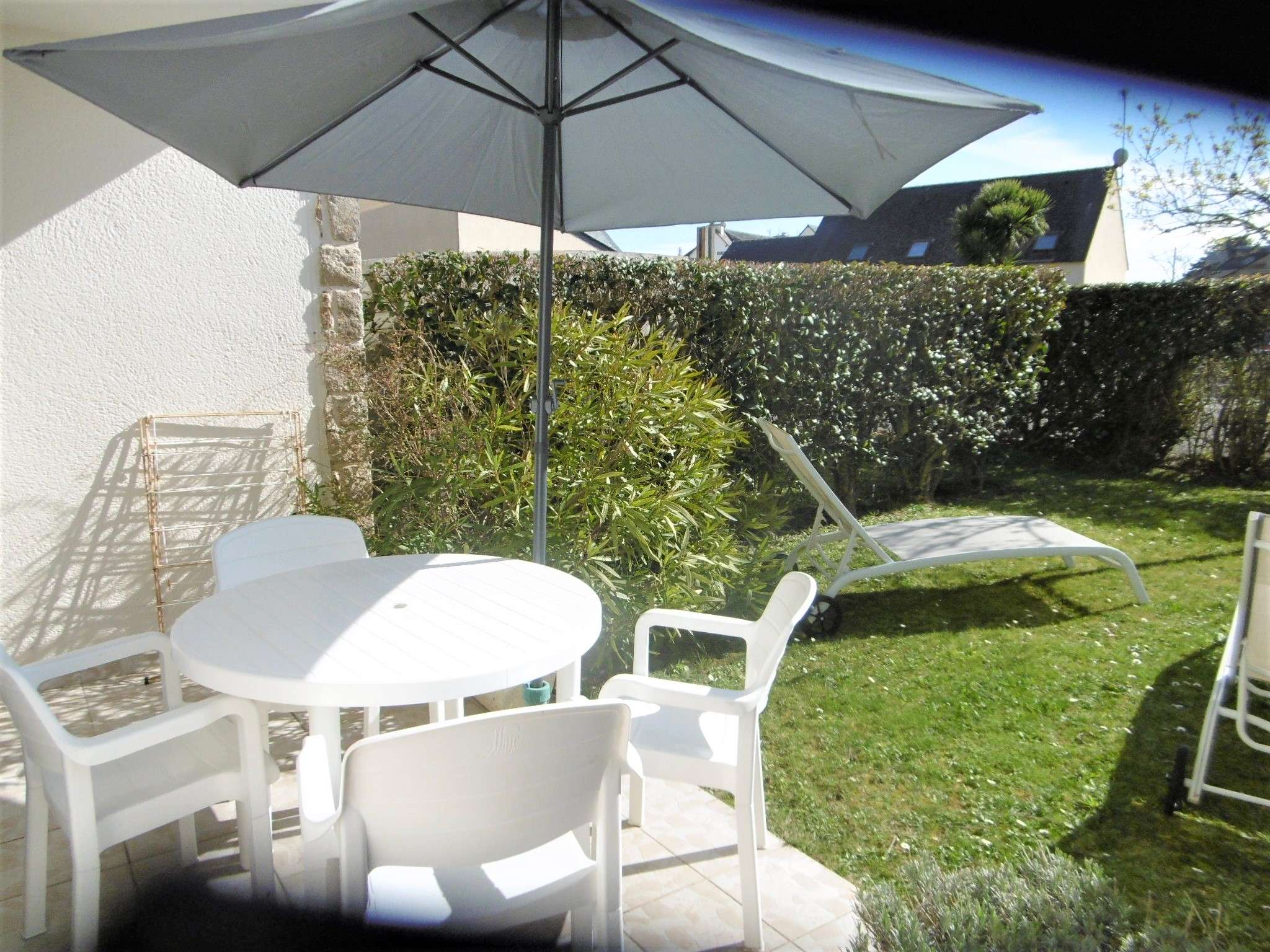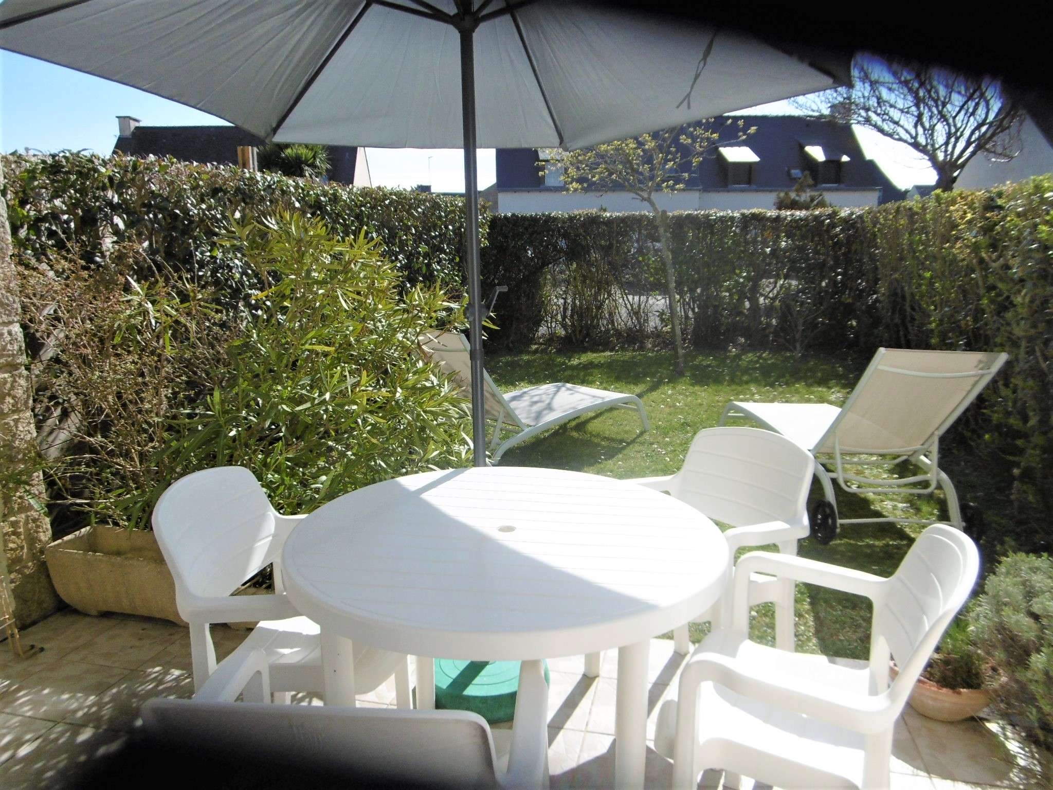 - Jardin non clos avec terrasse équipée d'un salon de jardin, de transats et d'un parasol.