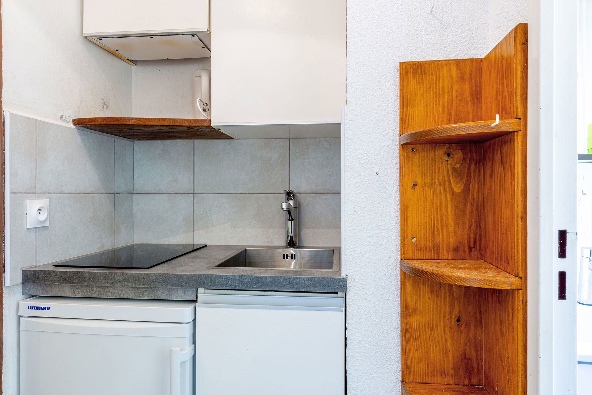 Kitchenette équipée d'un petit four, plaque vitrocéramique et micro-onde