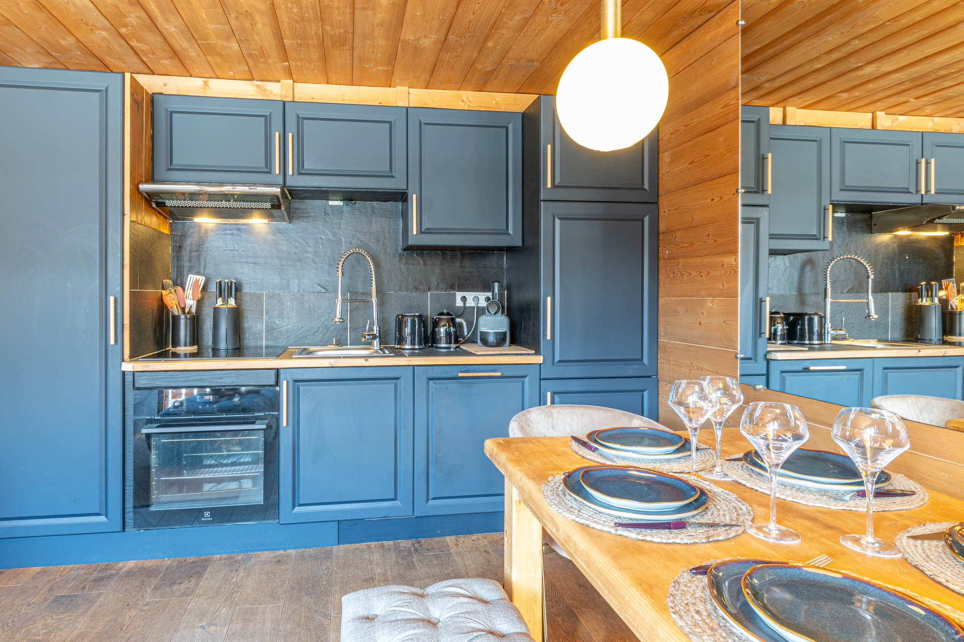 Equipée d'un lave-vaisselle, four, plaque vitrocéramique, réfrigérateur, hotte aspirante et four micro-ondes avec grill.