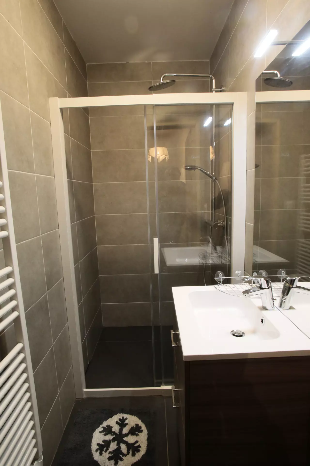 Salle d'eau : lavabo, douche et sèche-cheveux. WC indépendant