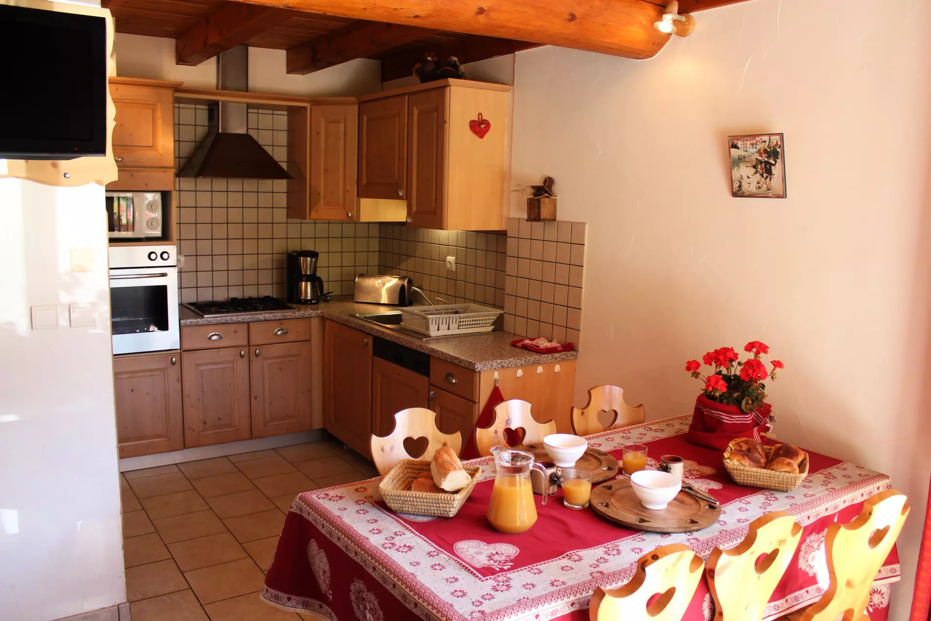 - Coin cuisine : four, micro-ondes, réfrigérateur (220L), feux gaz (3 foyers) + plaque électrique (1 foyer), lave-vaisselle et lave-linge.