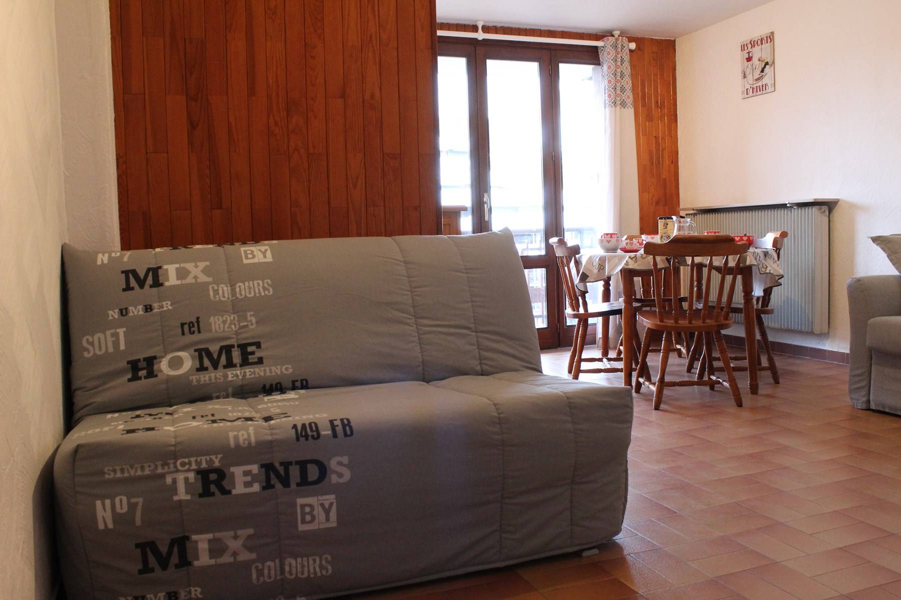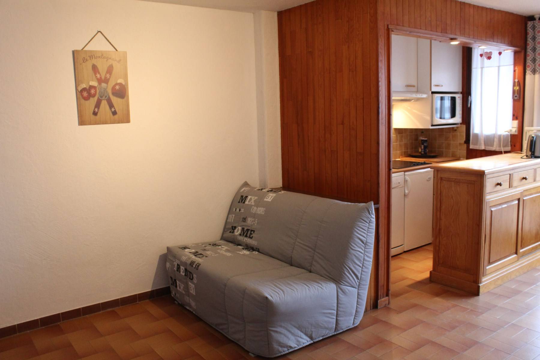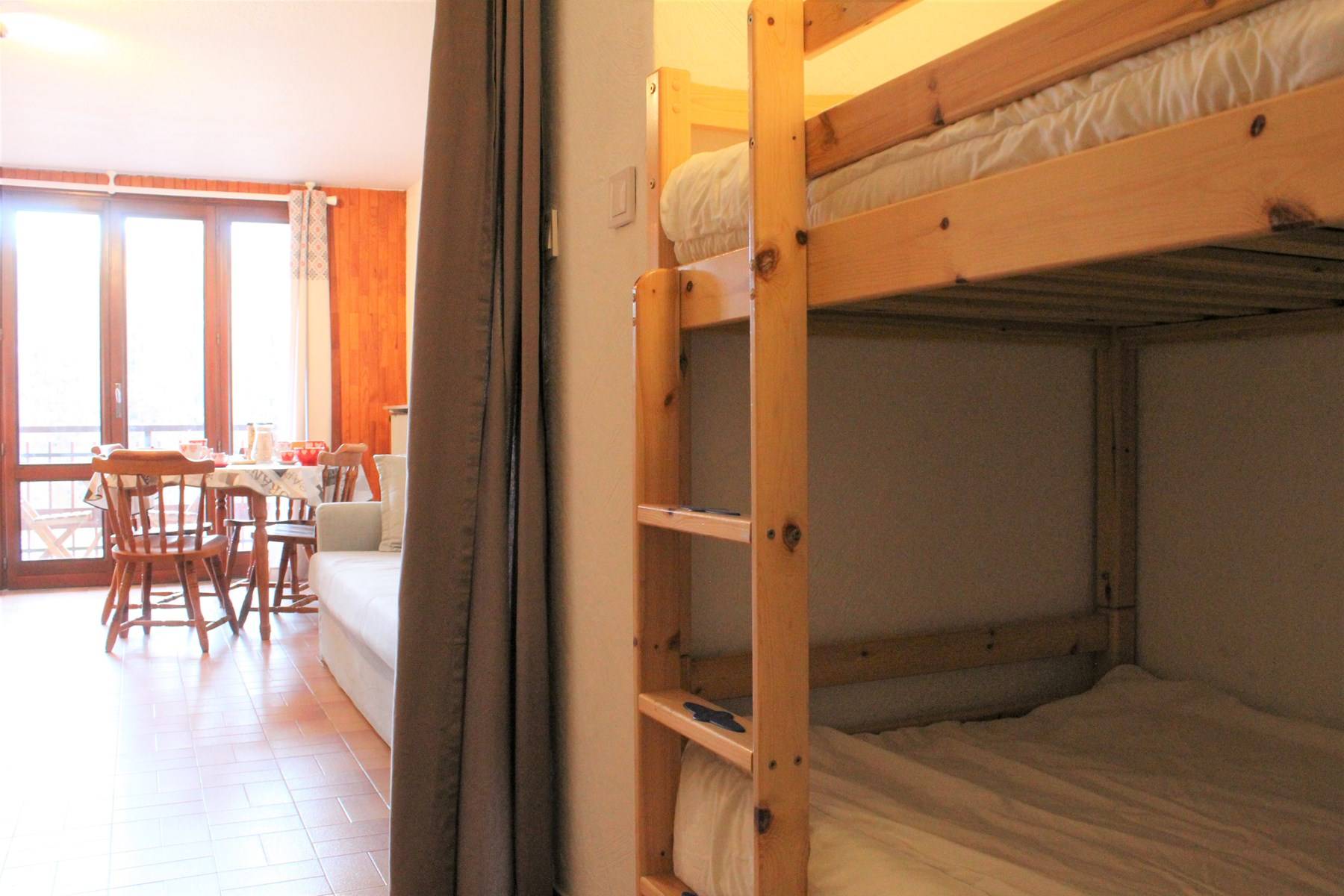Le logement : Cette location vacances comprend dans le séjour deux canapés convertibles clic clac deux places, un coin cuisine équipé et un balcon. Vous retrouverez dans l'entrée le coin montagne avec deux lits superposés une place. Et une salle d'eau avec douche et des WC indépendants.