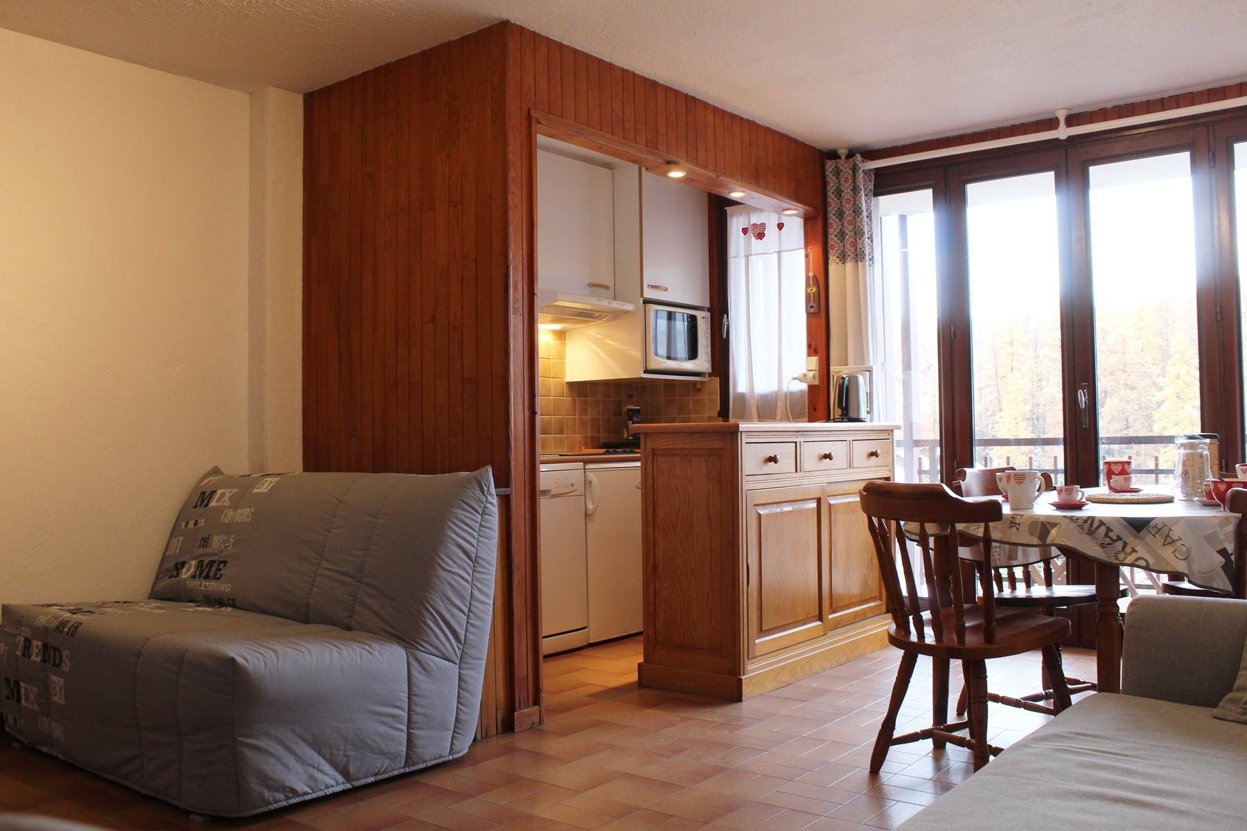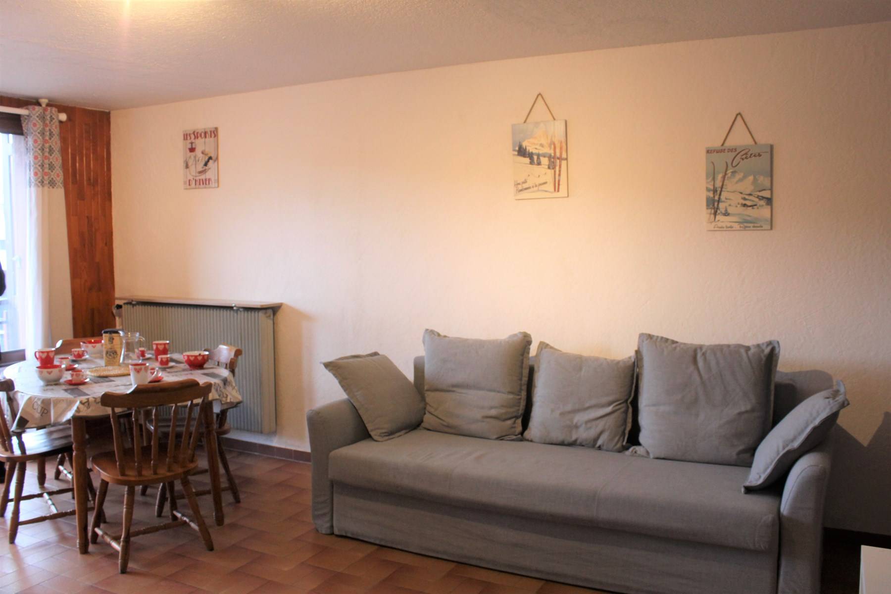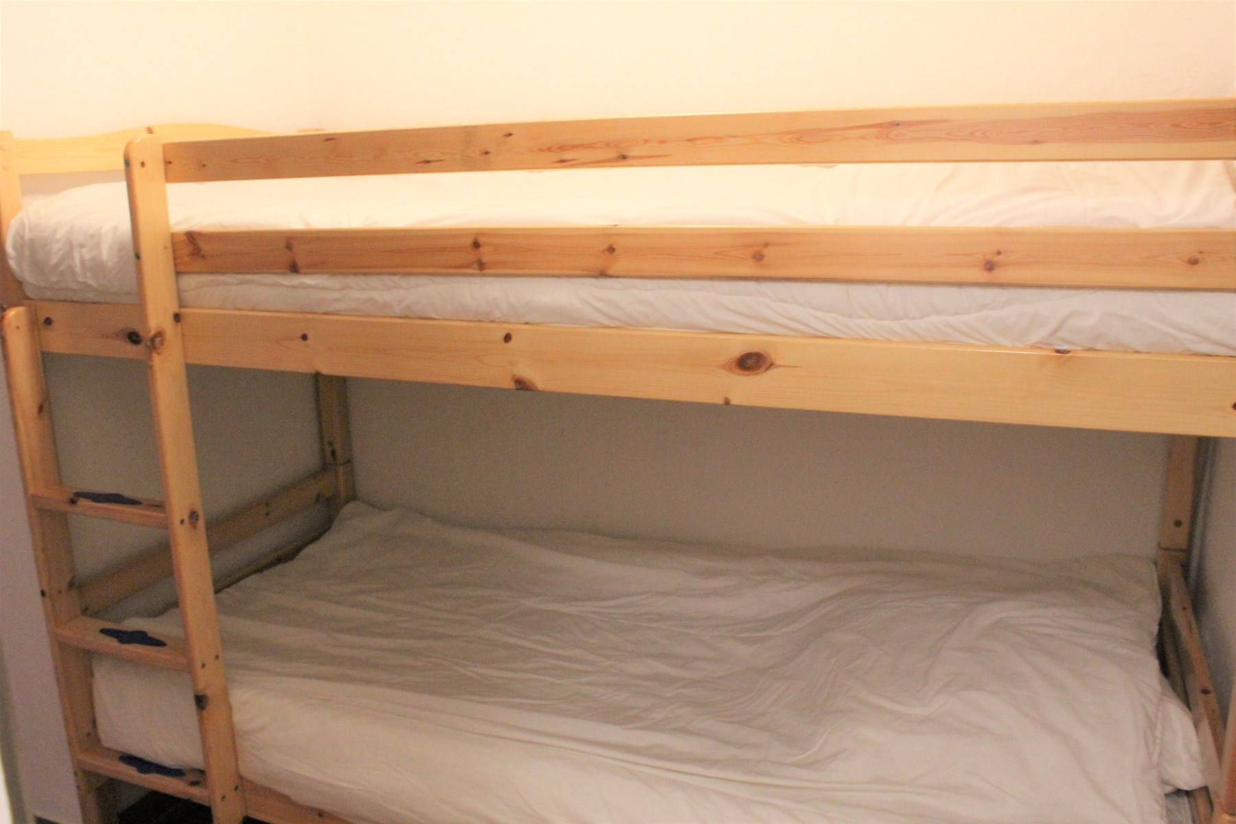 Le logement : Cette location vacances comprend dans le séjour deux canapés convertibles clic clac deux places, un coin cuisine équipé et un balcon. Vous retrouverez dans l'entrée le coin montagne avec deux lits superposés une place. Et une salle d'eau avec douche et des WC indépendants.