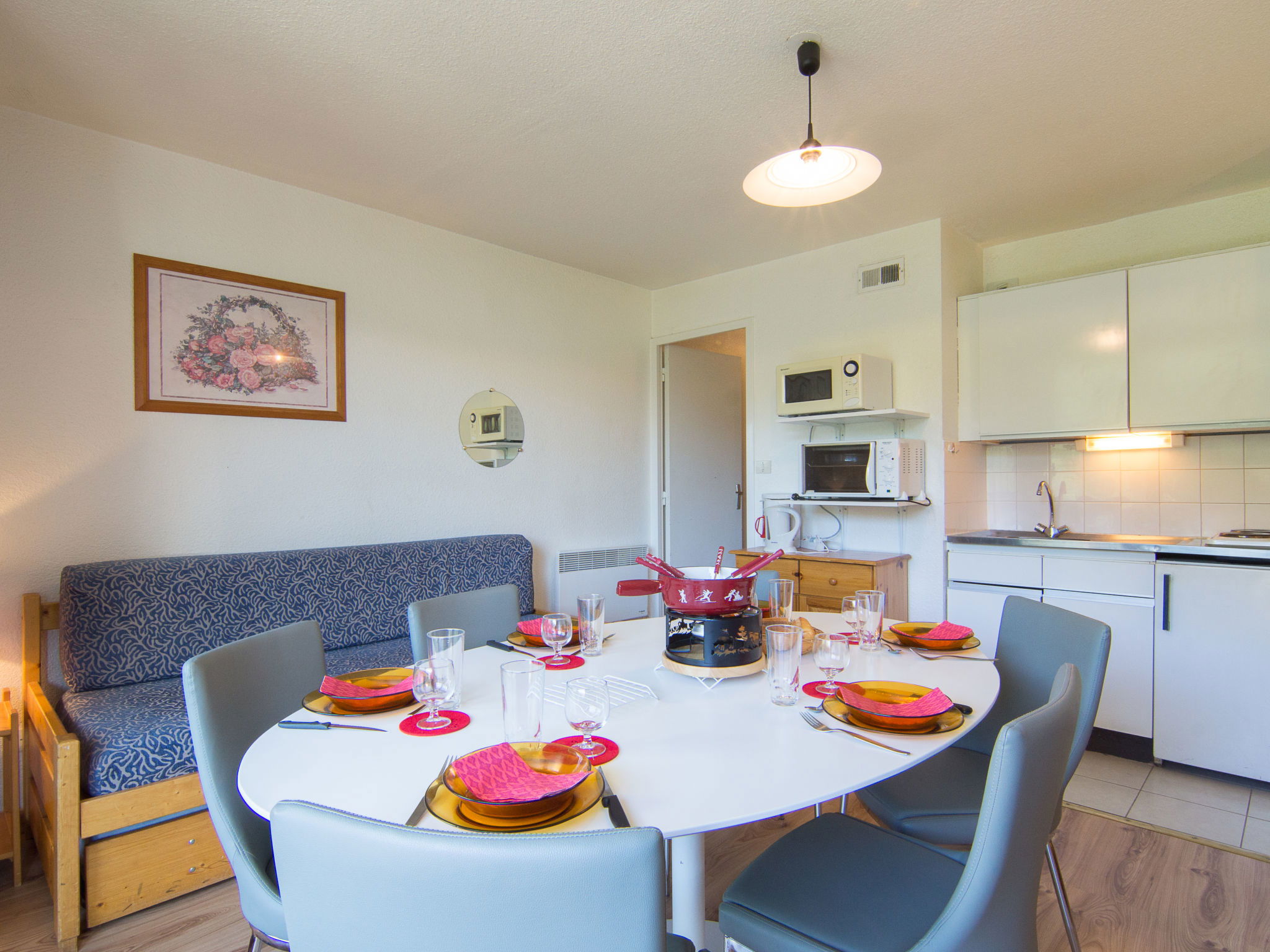Appartement de 3 pièces 40 m2 au 15ème étage, situation sud-est. Aménagement très simple: séjour/salle à manger avec 1 lit gigogne (2 pers. 2 x 80 cm, longueur 190 cm), TV (écran plat). Sortie sur le balcon, orientée sud. 1 chambre avec 1 grand-lit (140 cm, longueur 190 cm), volet roulant électrique. Sortie sur le balcon. 1 chambre avec 1 x 2 lits superposés (80 cm, longueur 190 cm), volet roulant électrique. Sortie sur le balcon. Coin cuisine (2 plaques de cuisson, four, bouilloire électrique, micro-ondes, cafetière électrique). Salle de bains, WC séparé. Chauffage électrique. Sol en parquet. 2 balcons 4 m2, situation sud et situation est. Mobilier de balcon, chaises longues (1). Vue sur les pistes de ski. A disposition: sèche-cheveux. Internet (Connexion WIFI, en sus). Veuillez noter: maximum 1 animal/ chien autorisé. Détecteur de fumée. FR18856