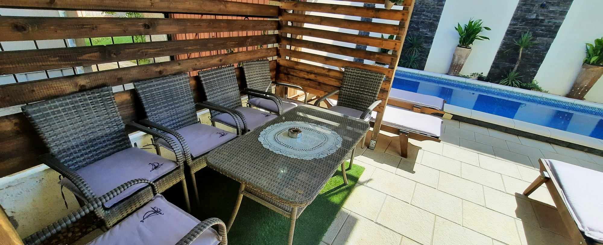 Elle dispose de jardin, mobilier de jardin, clôture, terrasse, lave-linge, barbecue, fer à repasser, accès internet (wifi), sèche-cheveux, climatisation, piscine privée, parking extérieur même bâtiment, 1 Télévision.