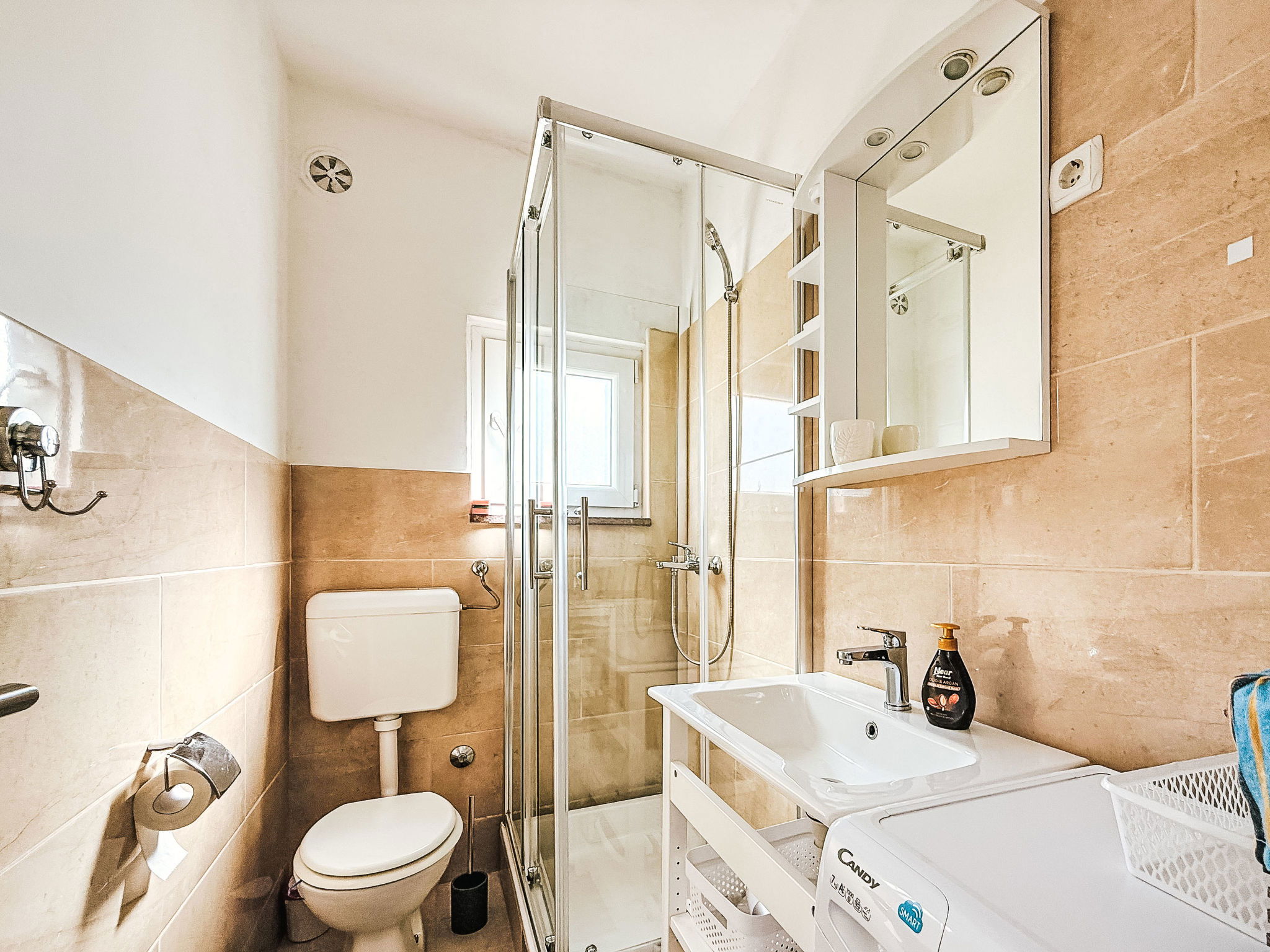 Appartement de 2 pièces 45 m2 au 1er étage. Séjour/salle à manger avec 2 divans-lits et TV (satellite) (écran plat), air-conditionné. Sortie sur le balcon. 1 chambre avec 1 grand-lit (160 cm, longueur 200 cm). Cuisine ouverte (1 plaque de cuisson, four, lave-vaisselle, 3 feux, grille-pain, bouilloire électrique, micro-ondes, congélateur, cafetière électrique). Douche/WC. Pas de chauffage. 2 balcons. Mobilier de balcon. A disposition: lave-linge. Internet (Connexion WIFI, gratuit). Veuillez noter: maximum 1 animal/ chien autorisé. Entrée privée.