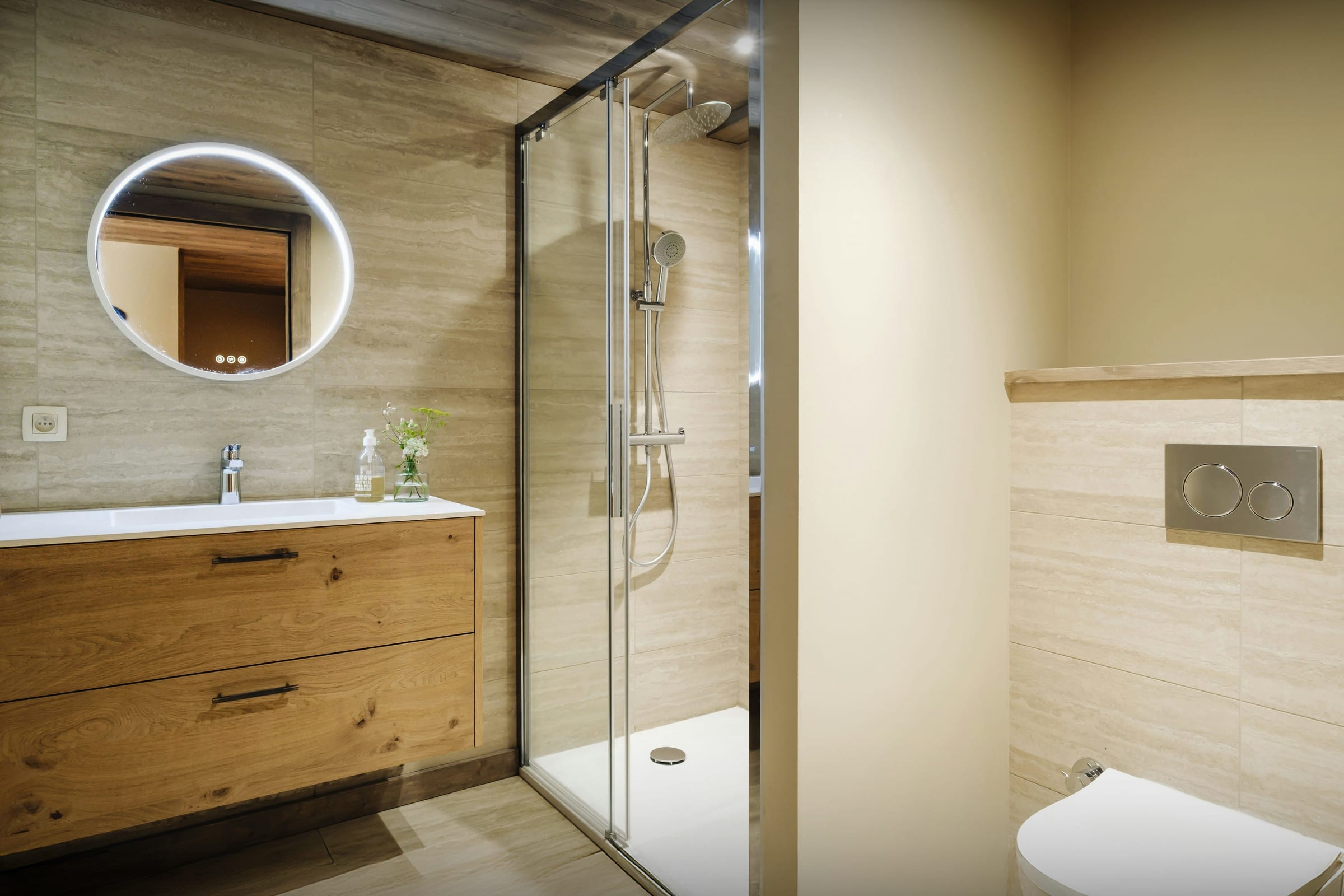 Le hall d’entrée connecté au local à skis permet de se mettre à l’aise dès son arrivée. Le garage peut abriter deux voitures, et il dispose d’une borne de recharge pour véhicules électriques.