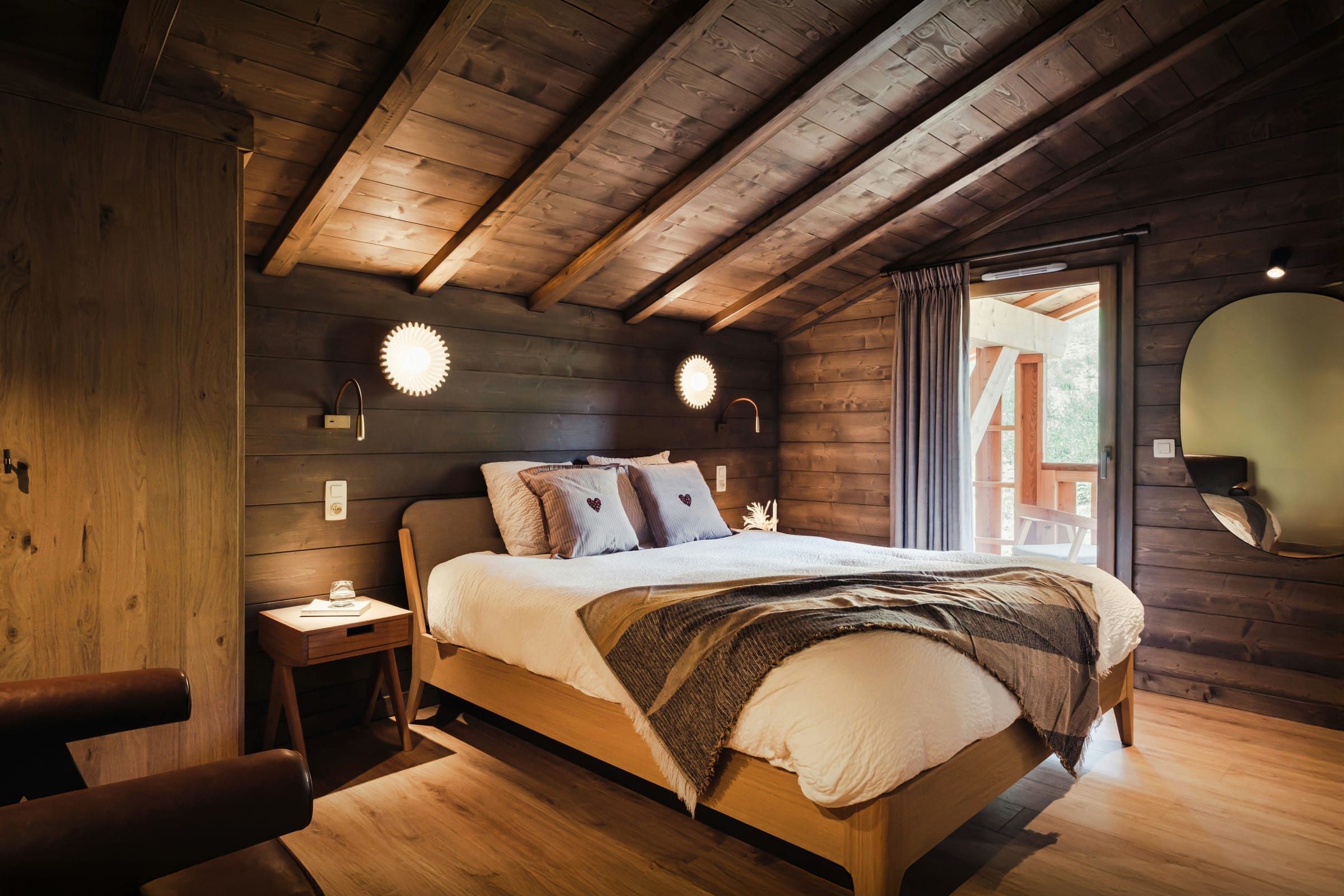 La décoration du chalet est soignée, les équipements sont haut de gamme, et de grandes baies vitrées baignent la pièce de vie de lumière naturelle. Celle-ci inclut une télévision et une cheminée, pour se réchauffer lors des longues soirées d’hiver.