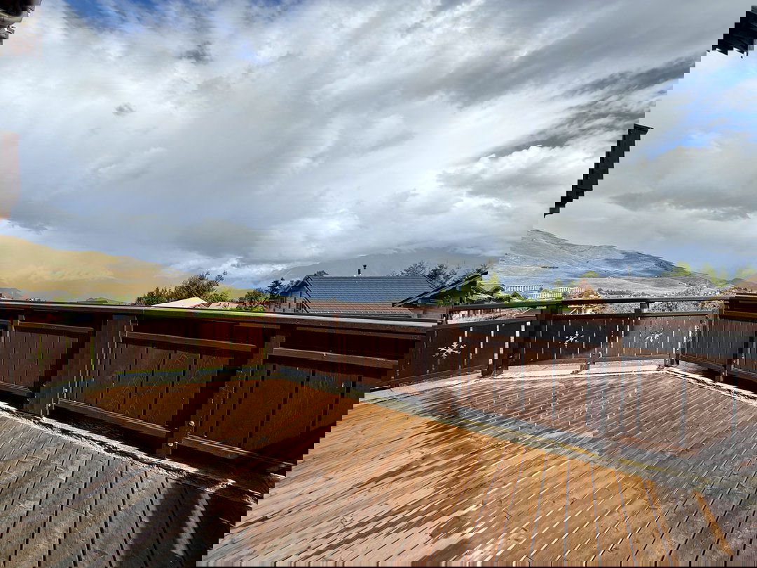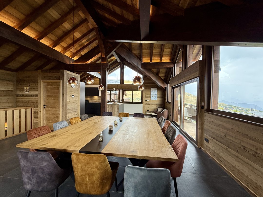 À l’étage supérieur, les convives découvrent une vaste pièce de vie sous charpente, baignée de lumière grâce à son exposition plein sud. Le salon s’articule autour d’une grande table conviviale, idéale pour des repas chaleureux en famille ou entre amis. La cuisine ouverte, moderne et entièrement équipée, se distingue par sa fonctionnalité et son esprit convivial. Depuis cet espace, une grande terrasse ouest accueille un jacuzzi panoramique, parfait pour profiter des derniers rayons du soleil face aux montagnes. Un WC indépendant est également présent à ce niveau.