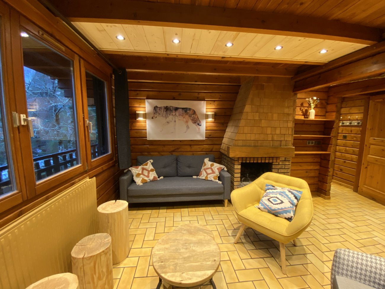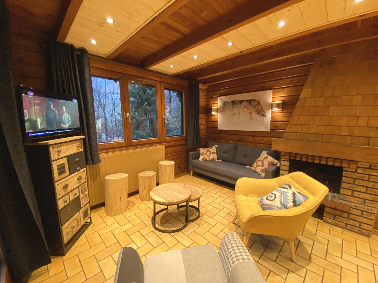 • Salon/Séjour : Espace chaleureux avec canapé confortable, cheminée, télévision à écran plat et coin repas, idéal pour se détendre en famille ou entre amis