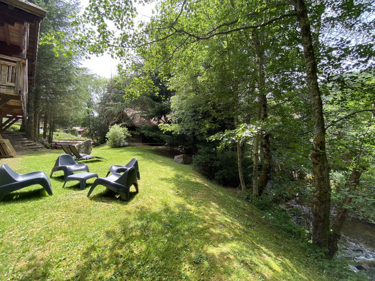 • Jardin avec grand espace vert en bord de rivière, idéal pour les activités en plein air.