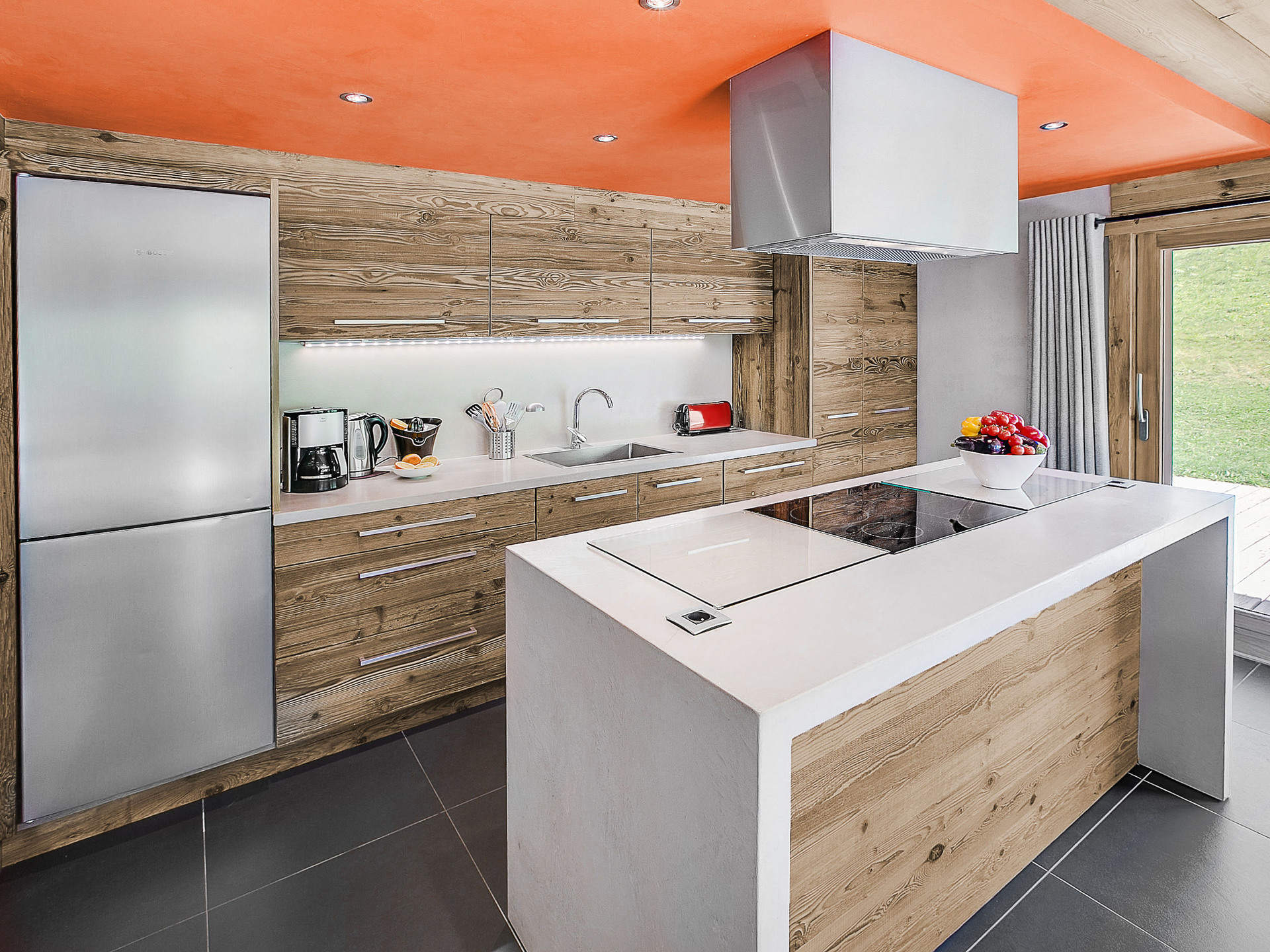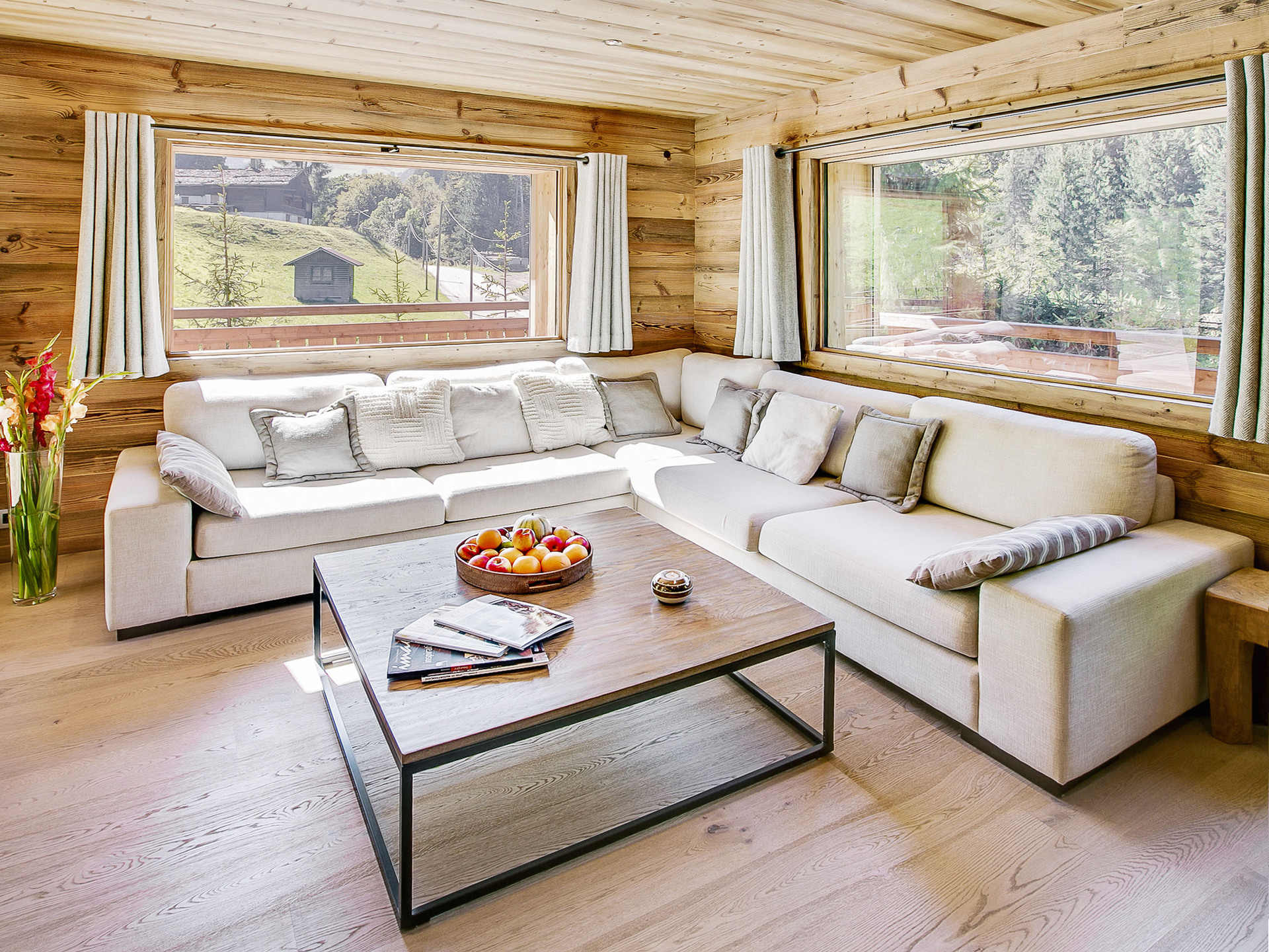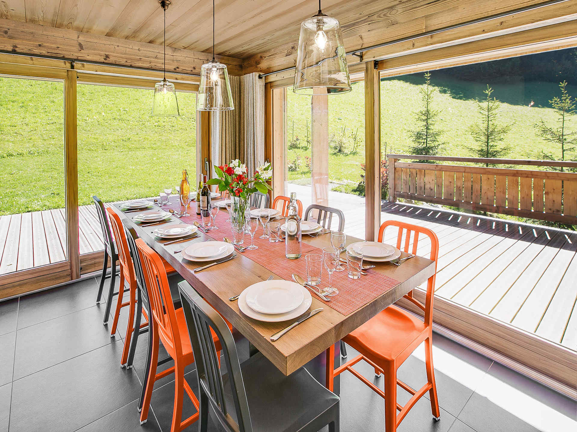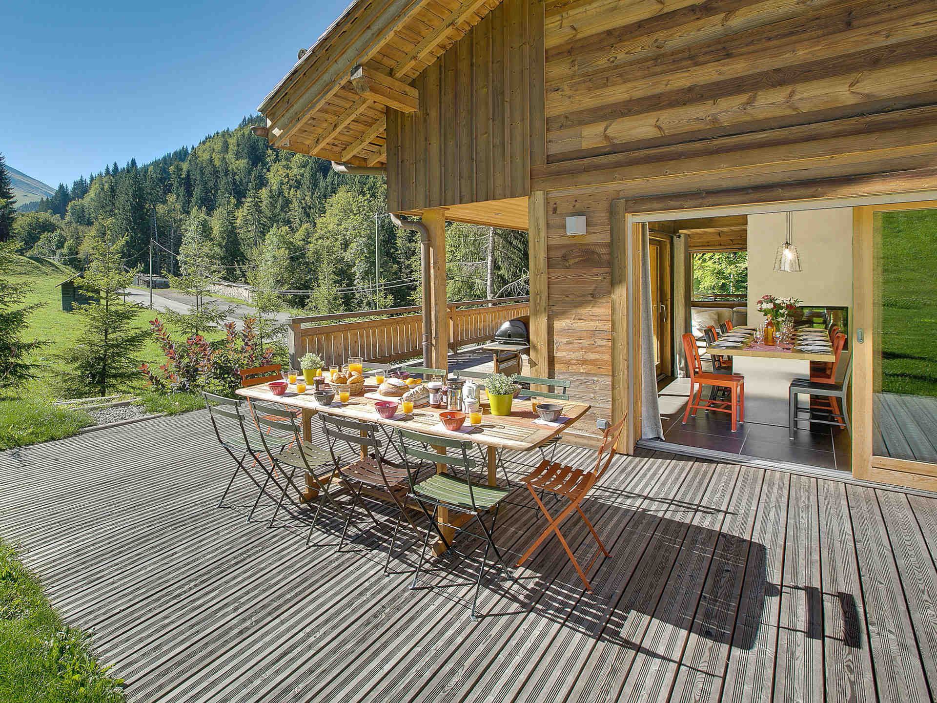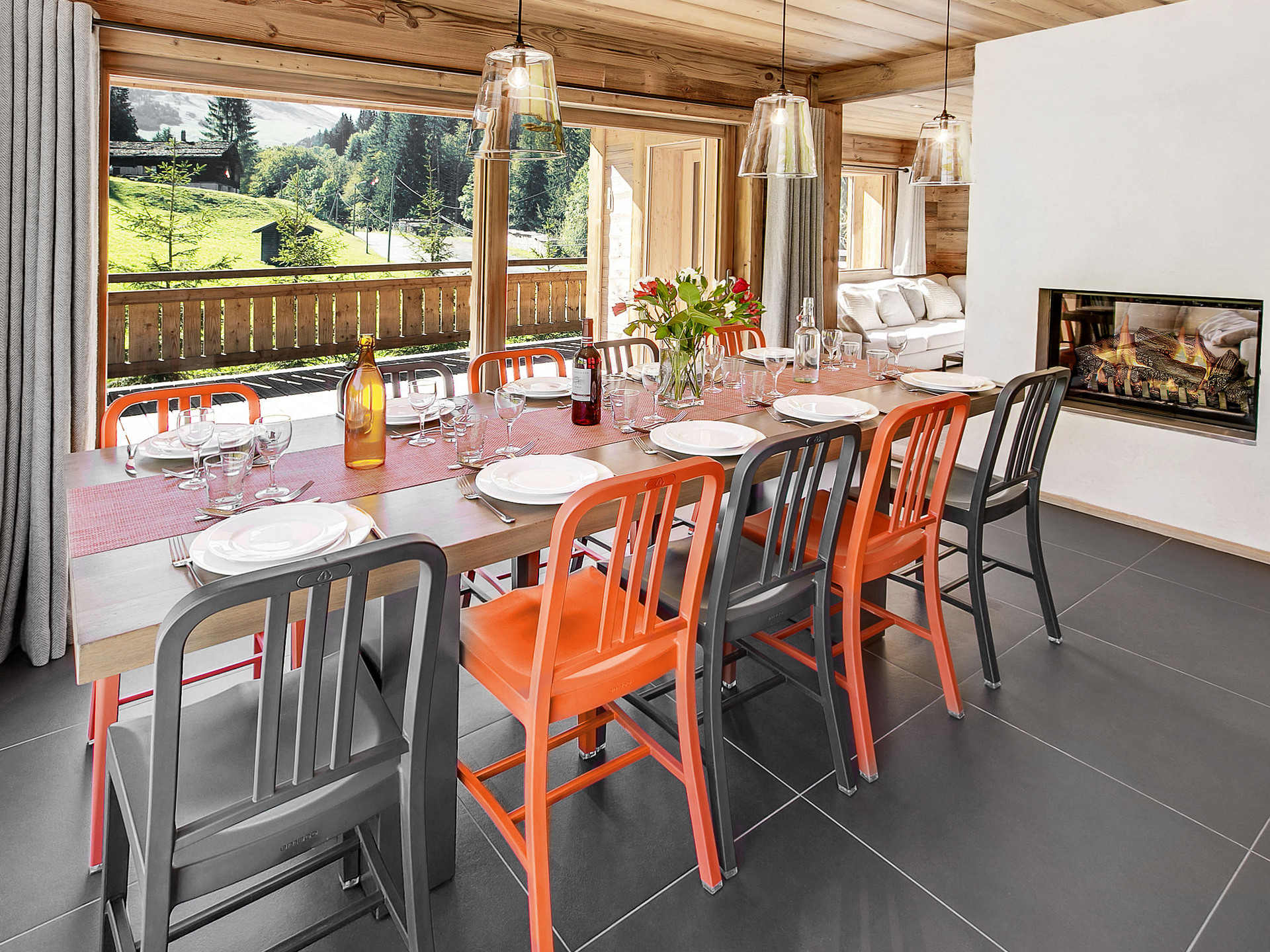 Le cœur du chalet s’articule autour d’une vaste pièce de vie mêlant charme montagnard et ambiance contemporaine. Le salon, avec sa cheminée invite à la détente, tandis que la cuisine ouverte, entièrement équipée se prolonge sur un coin repas qui accueille de grandes tablées conviviales. La terrasse, accessible directement depuis la pièce de vie, s’ouvre sur l’extérieur et permet de profiter pleinement des repas en plein air.