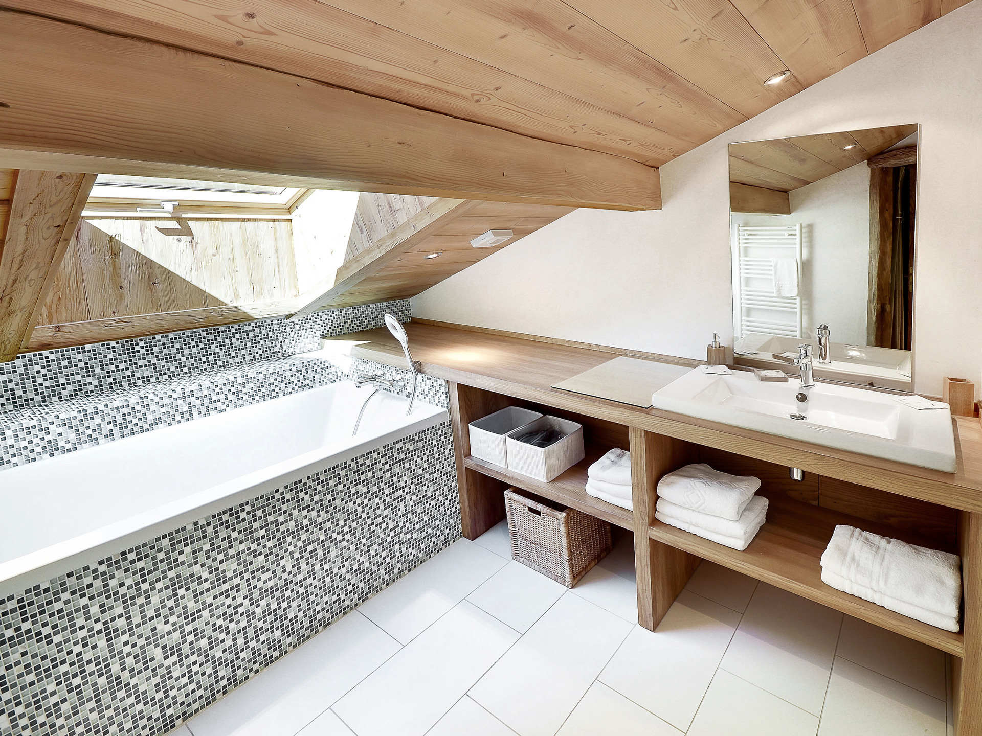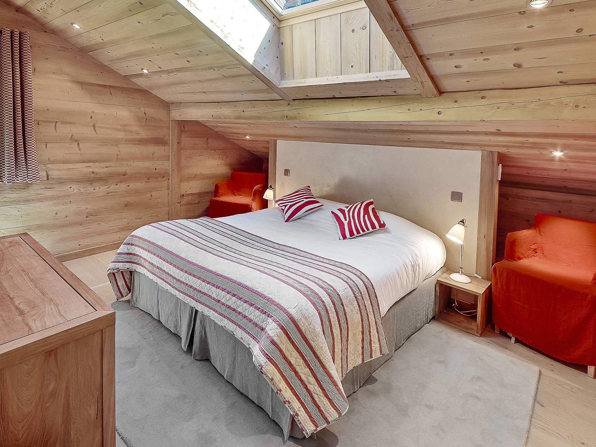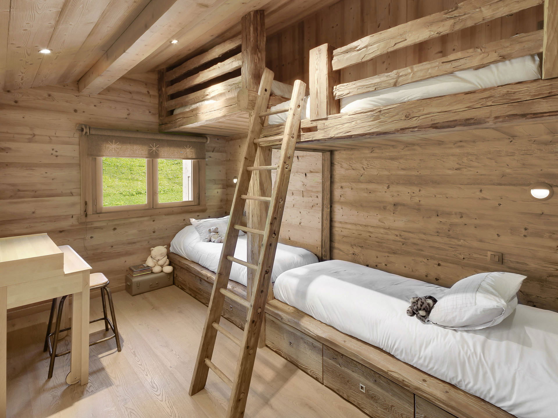 Une chambre comprend deux fois deux lits superposés (90 cm) et une salle de bains attenante avec baignoire. Une chambre double (lit 160 cm) avec salle d’eau ouverte (douche) partagent la vue sur les pistes. Enfin, une dernière chambre double (lit 160 cm) avec salle d’eau ouverte (douche) s’ouvre sur l’avant du chalet. Un salon TV avec coin lecture et un WC indépendant complètent ce niveau, propice aux soirées paisibles et aux moments de partage.