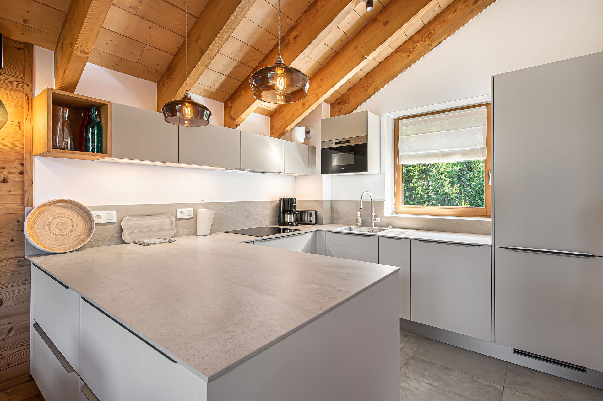 - Cuisine ouverte, équipée : réfrigérateur, four, four micro-onde, lave-vaisselle, plaque induction, bouilloire électrique, grille-pain, cafetière électrique, Nespresso, mixeur, appareil à raclette, service à fondue