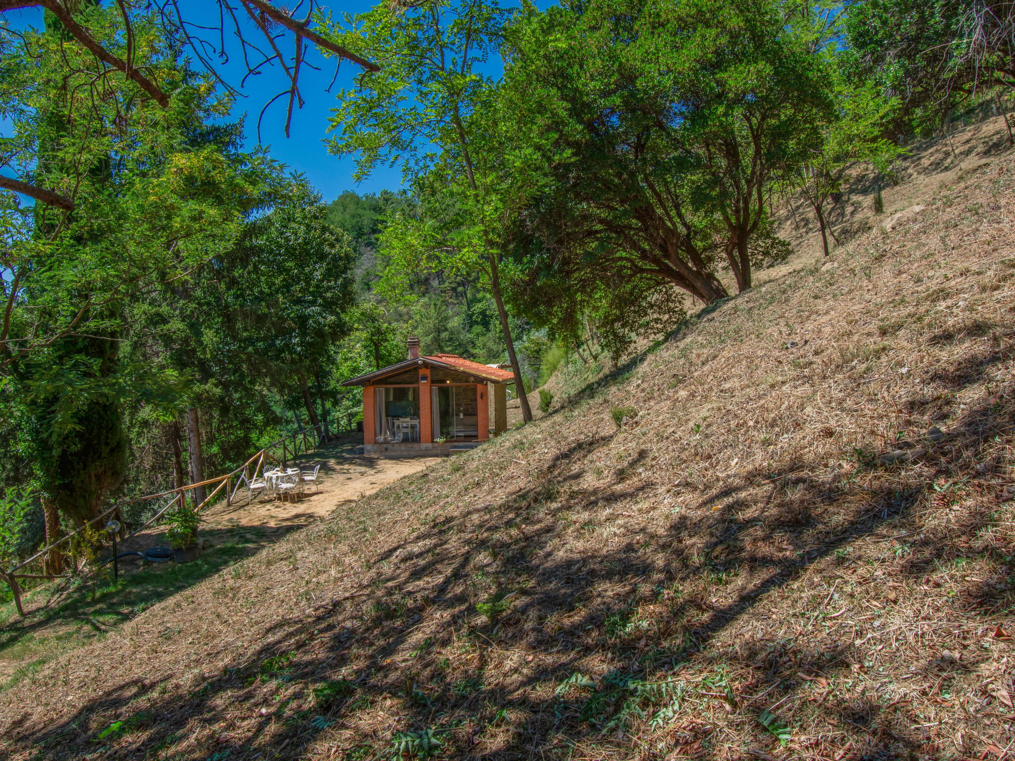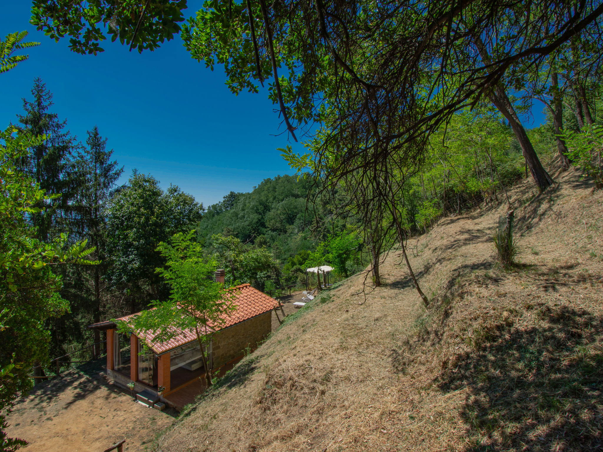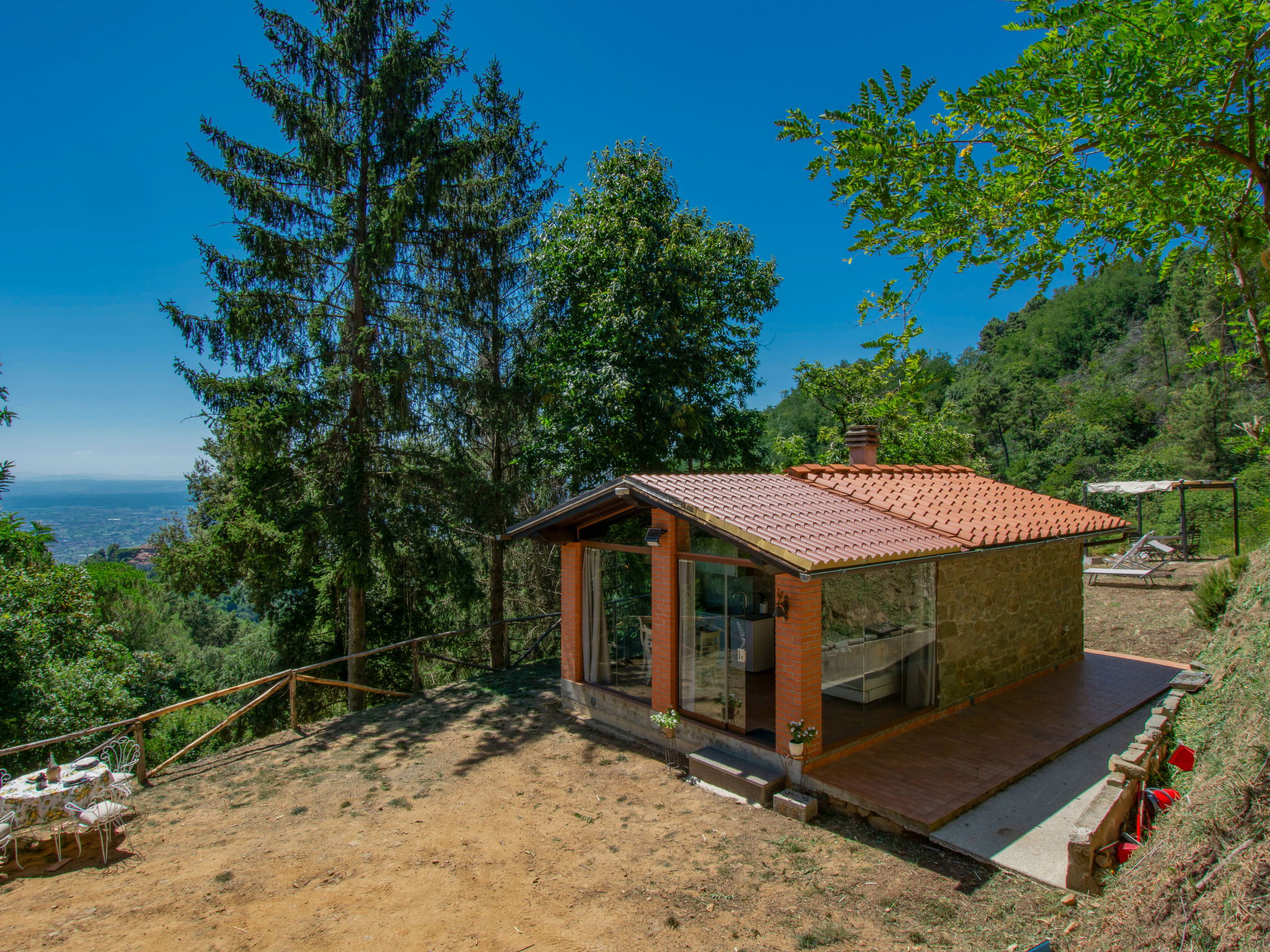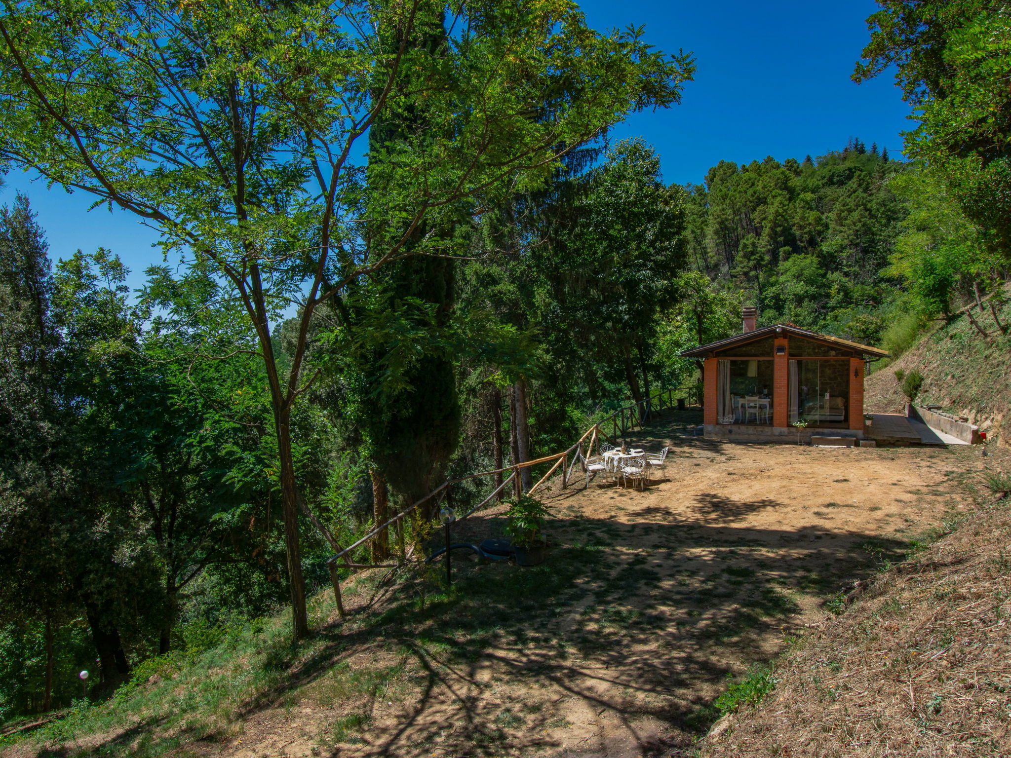 Chalet moderne, accueillant, individuel "Rifugio di Igor", 670 m au dessus du niveau de la mer, renové en 2025, environné par les arbres. Situation isolée, tranquille, dans la verdure, dans la forêt. A usage privé: parc 1'500 m2 (clôturé), jardin propice à la détente. Douche extérieure, bain à remous , meubles de jardin, barbecue. Infrastructures de la Maison: air-conditionné, lave-linge, possibilité de chauffage uniquement du 15.Nov. - 15.Avr.. Accès en voiture jusqu'à 250 m de la maison par un chemin raide, étroite (chemin non goudronné, route de montagne). Place de parking (pour 2 voitures) sur le terrain. Magasins 2 km, supermarché 2 km, centre commercial 2 km, arrêt de bus 2 km. Chemins de randonnées pédestres depuis la maison 50 m, téléphérique 5 km. Attractions à proximité: Montecatini Terme 6 km, Lucca 30 km, Firenze 55 km, Torre di Pisa 55 km. Veuillez noter: équipement pour bébés sur demande (inclus). Bien convenant à 2 adultes + 1 enfant. Résidence avec portail électrique.