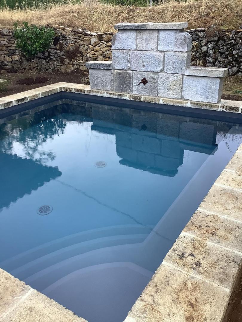 Belle terrasse couverte avec barbecue, en face d’une charmante piscine privative au sel (4x4 m, profondeur 1,34 m), sécurisée par alarme et bâche à barres, ouverte de juin à fin septembre.