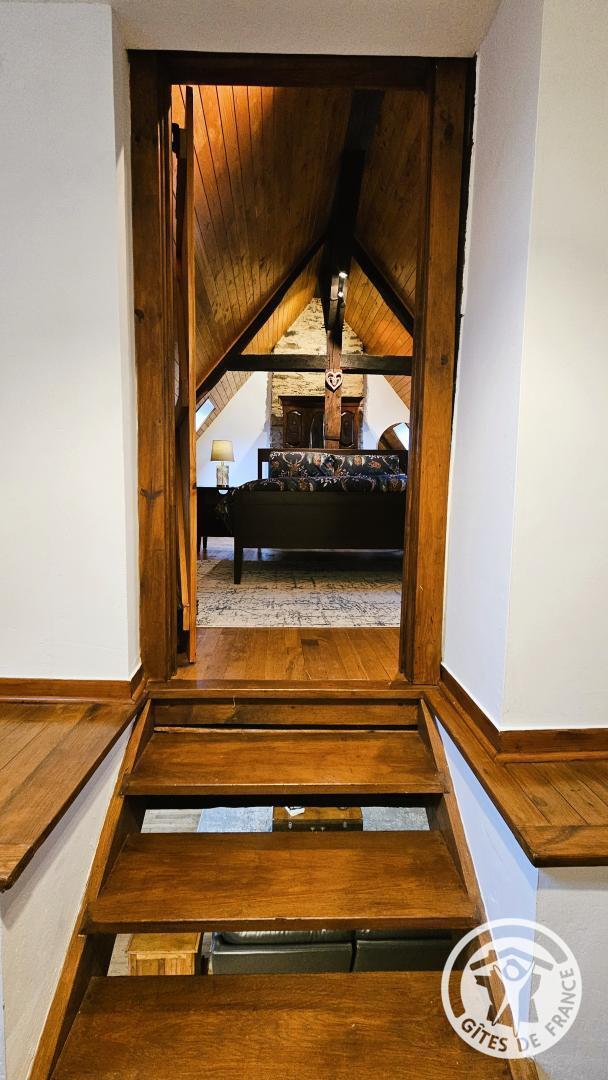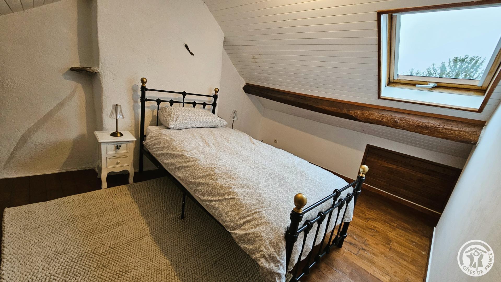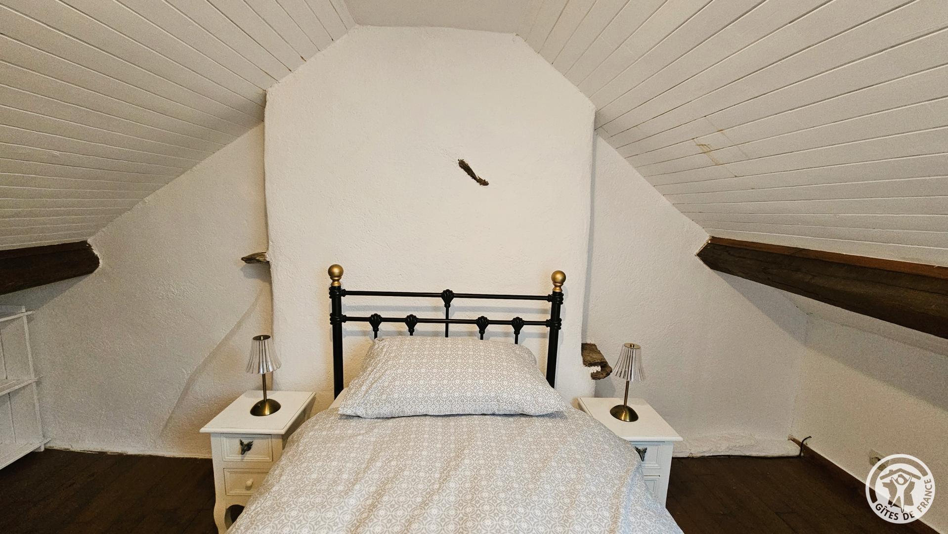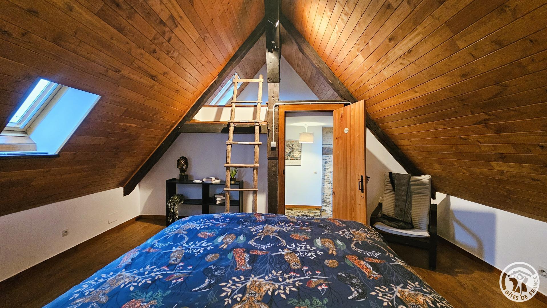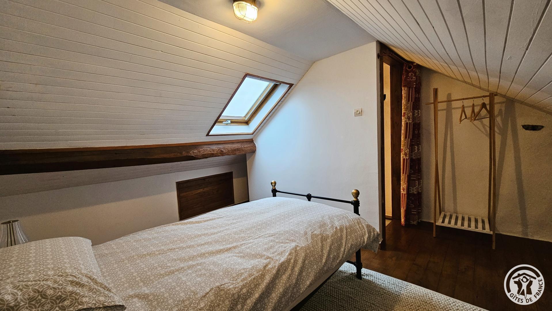 Aux combles, accessible par un escalier à forte pente, typique des anciennes maisons, se trouve un espace cosy, idéal pour un adolescent ou un adulte :