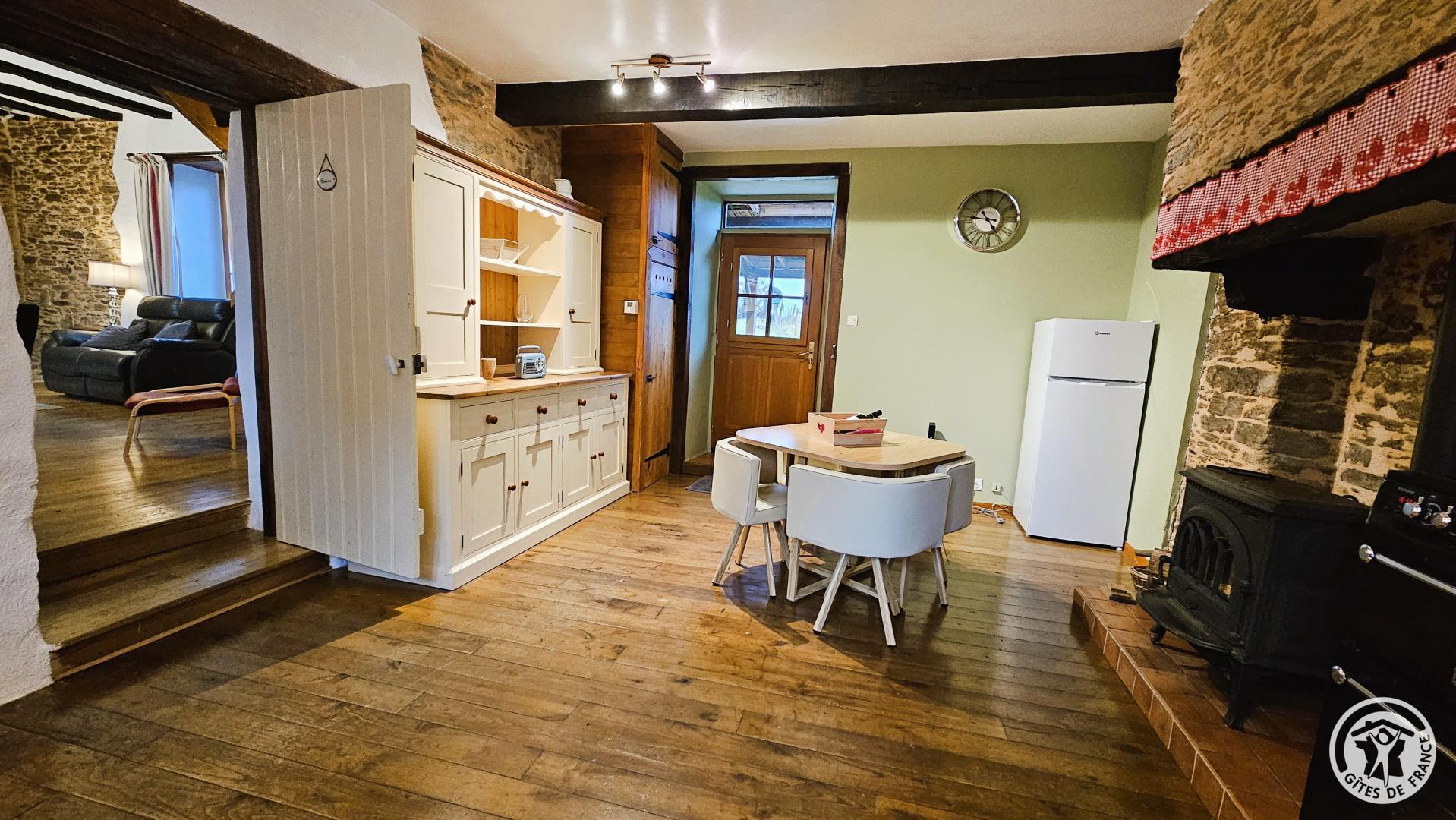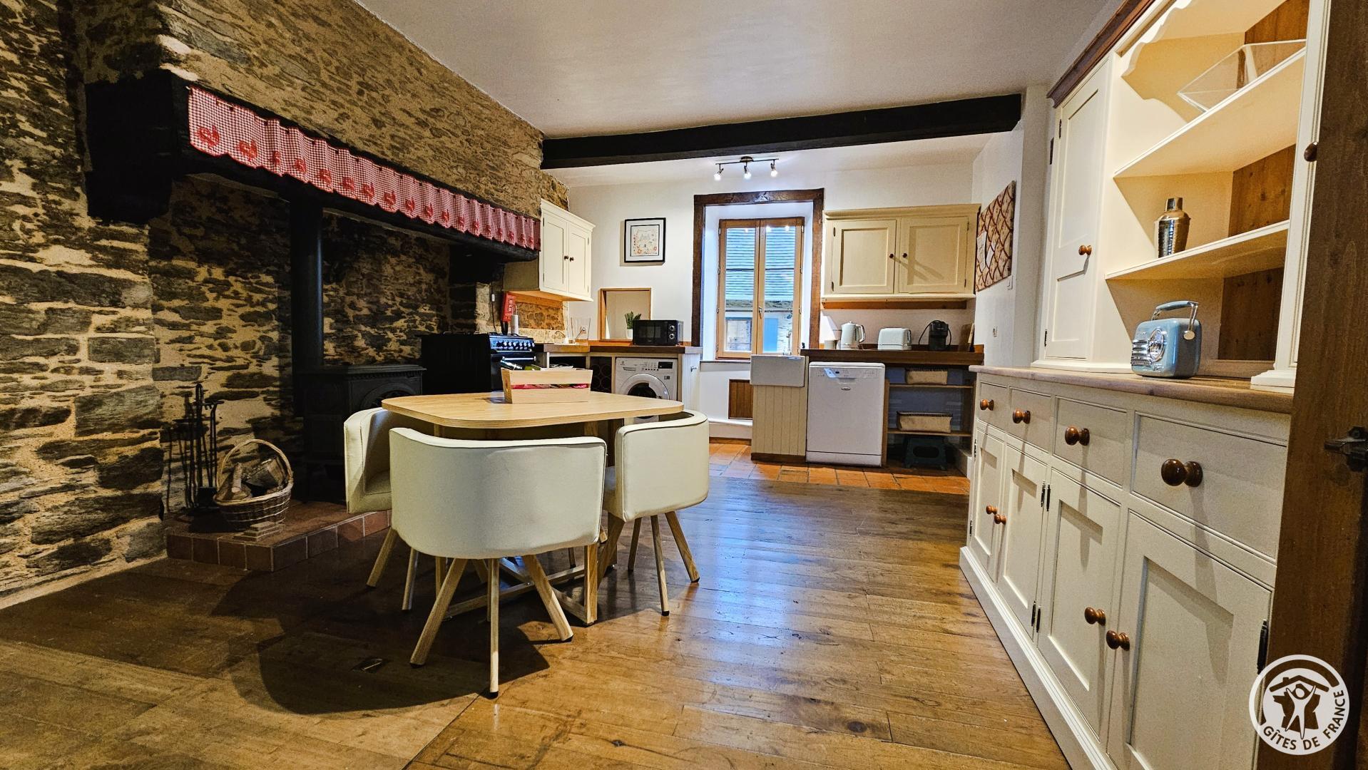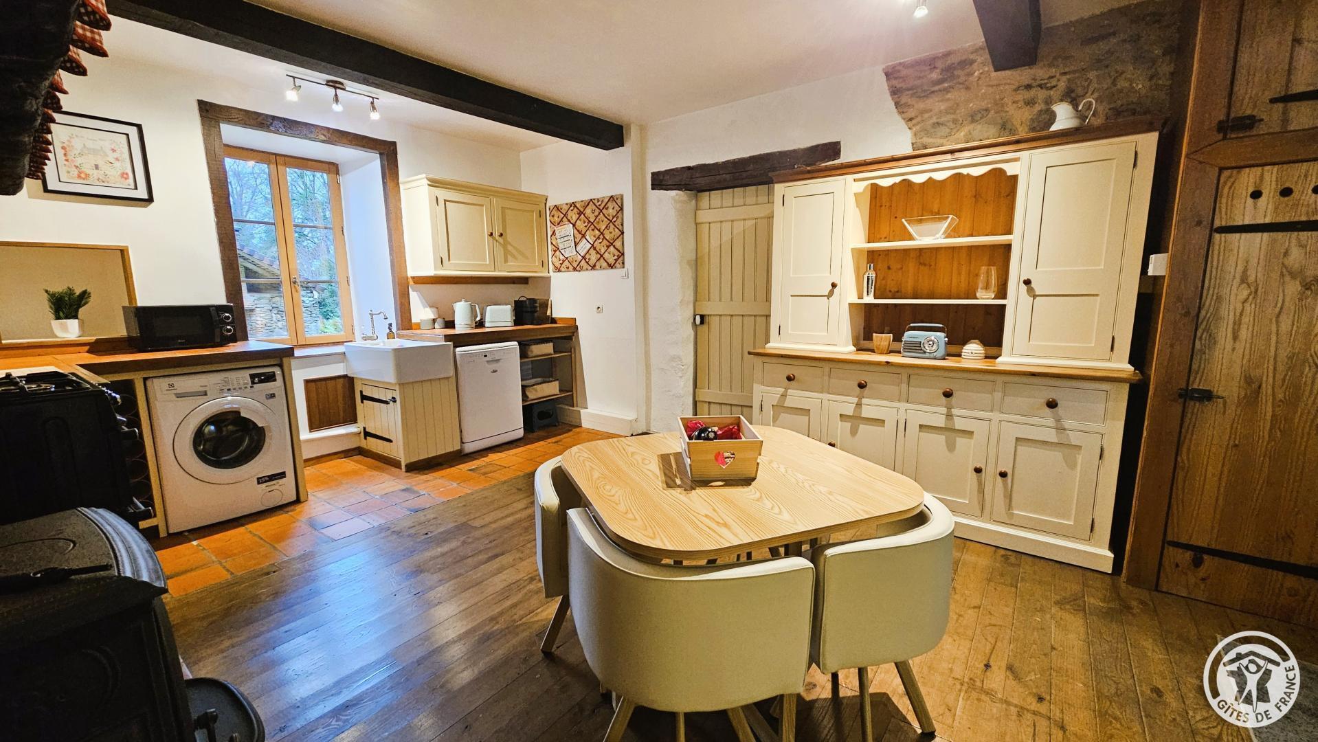 - Cuisine entièrement équipée : poêle à bois, réfrigérateur, four et gazinière à 4 feux, lave-vaisselle, lave-linge, micro-ondes, cafetière à dosettes (Nespresso), bouilloire, grille-pain