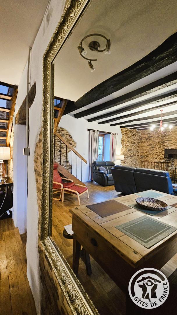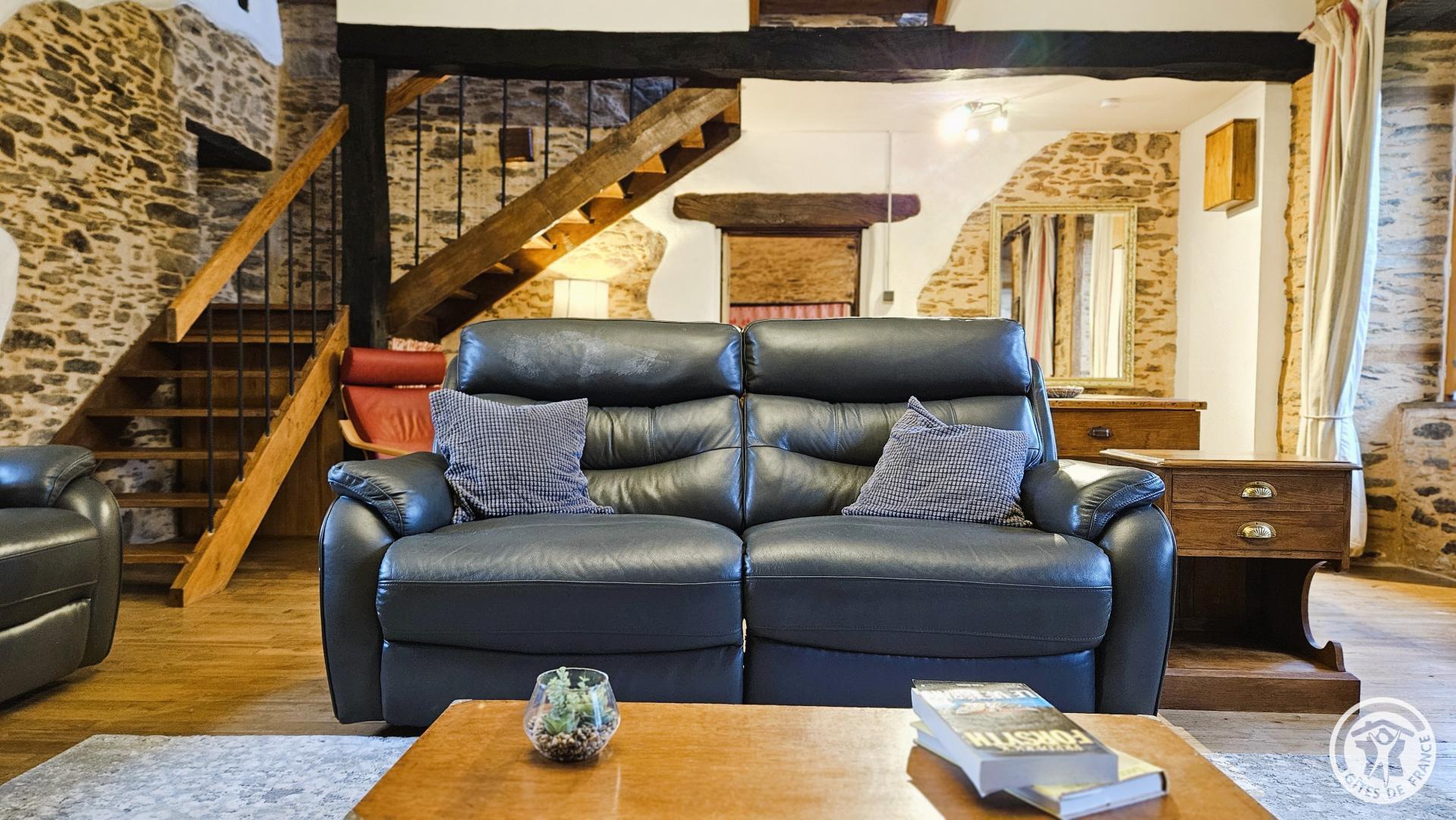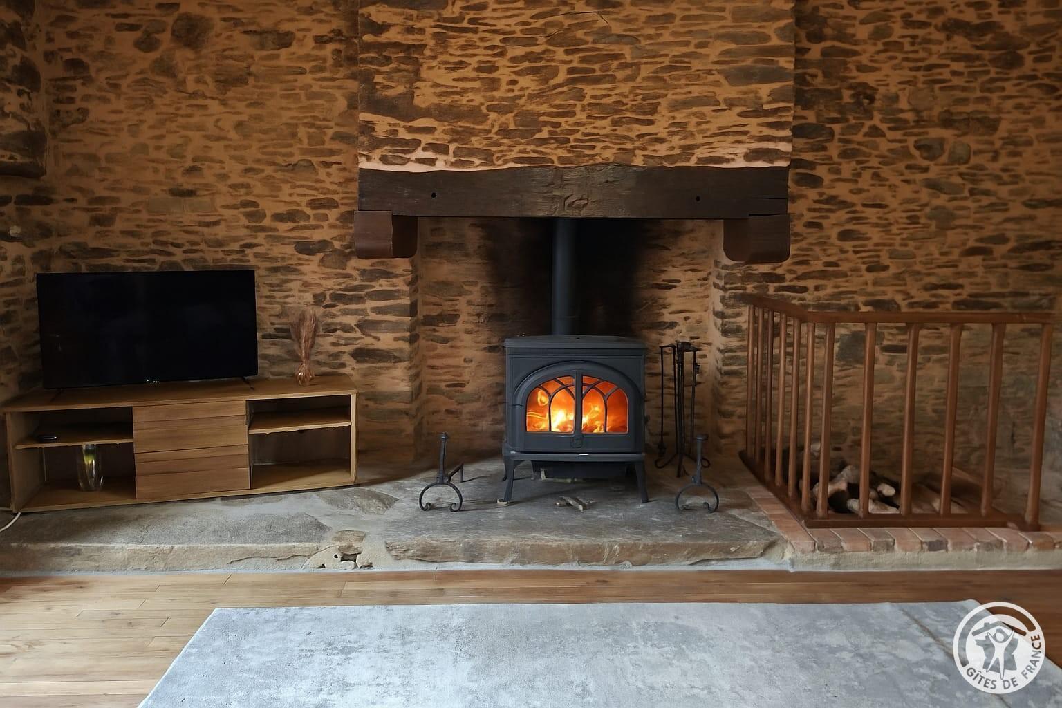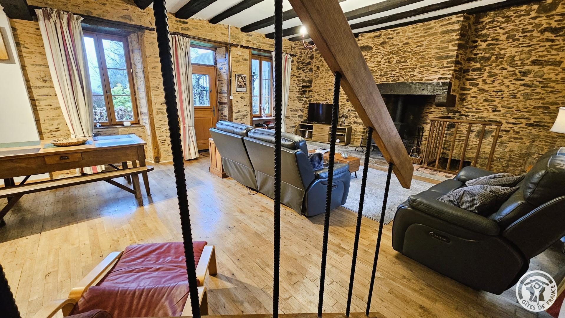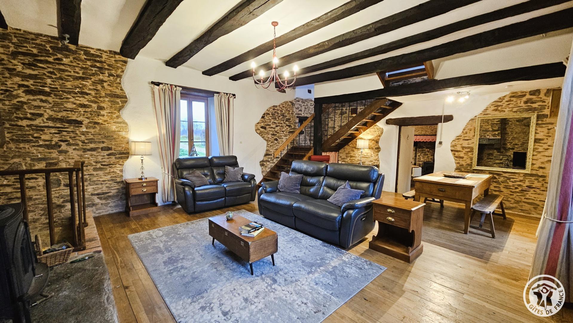 - Une petite marche mène à la pièce de vie : salon/séjour avec poêle à bois dans le cantou, décor authentique, télévision, canapés, grande table et chaises.