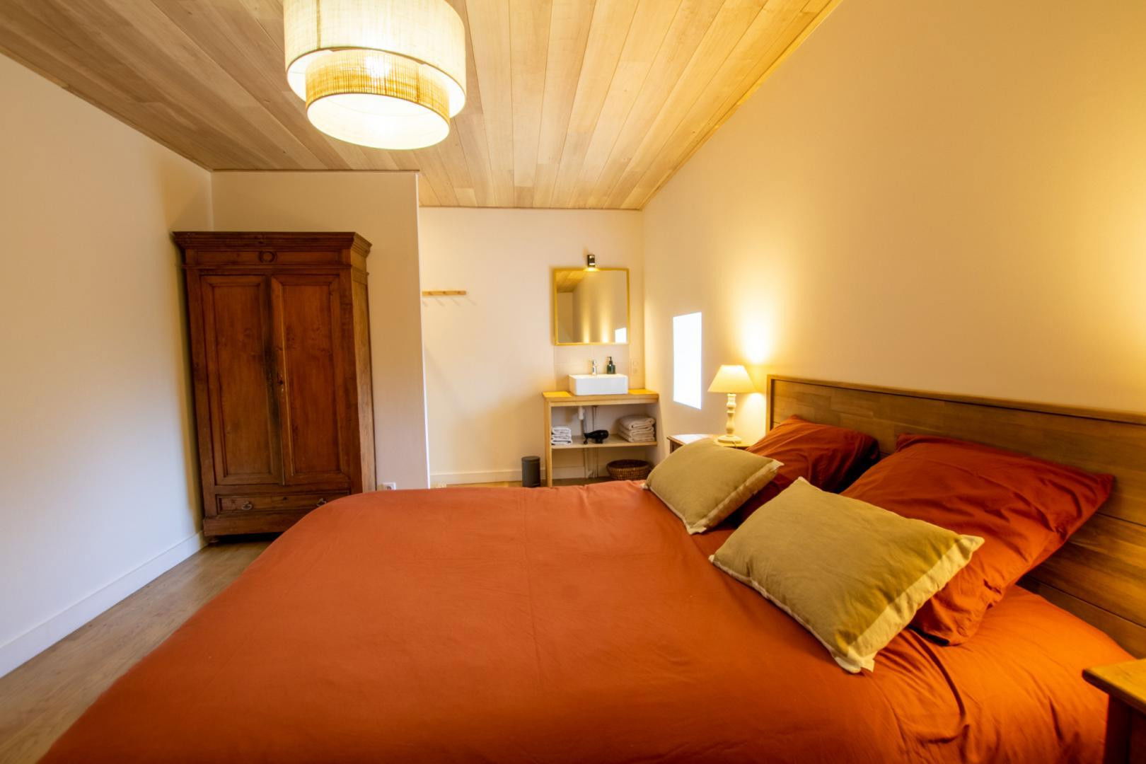 A l'étage, 2 chambres avec 3 lits 160 (90 lit disponible en plus dans une chambre) avec salle d'eau privative ouverte sur la chambre, WC indépendants avec lave-mains.