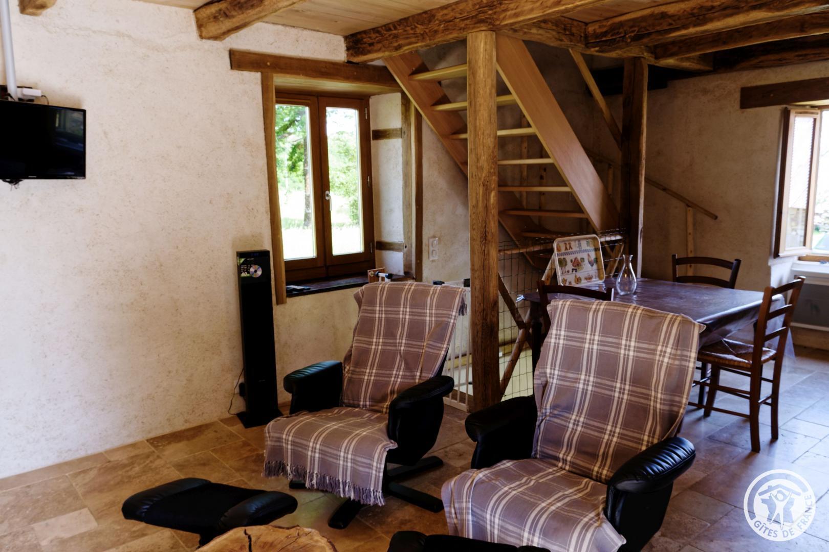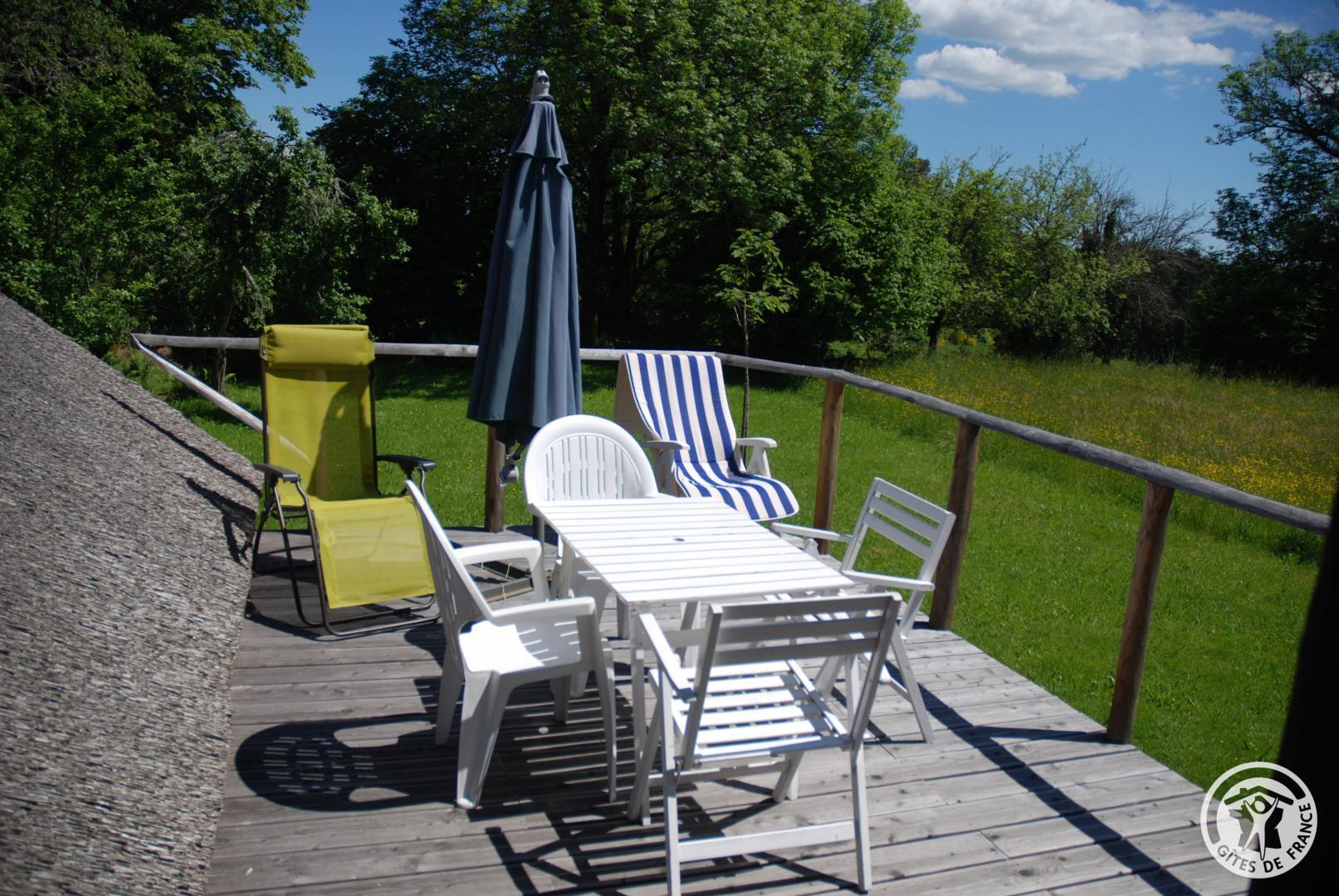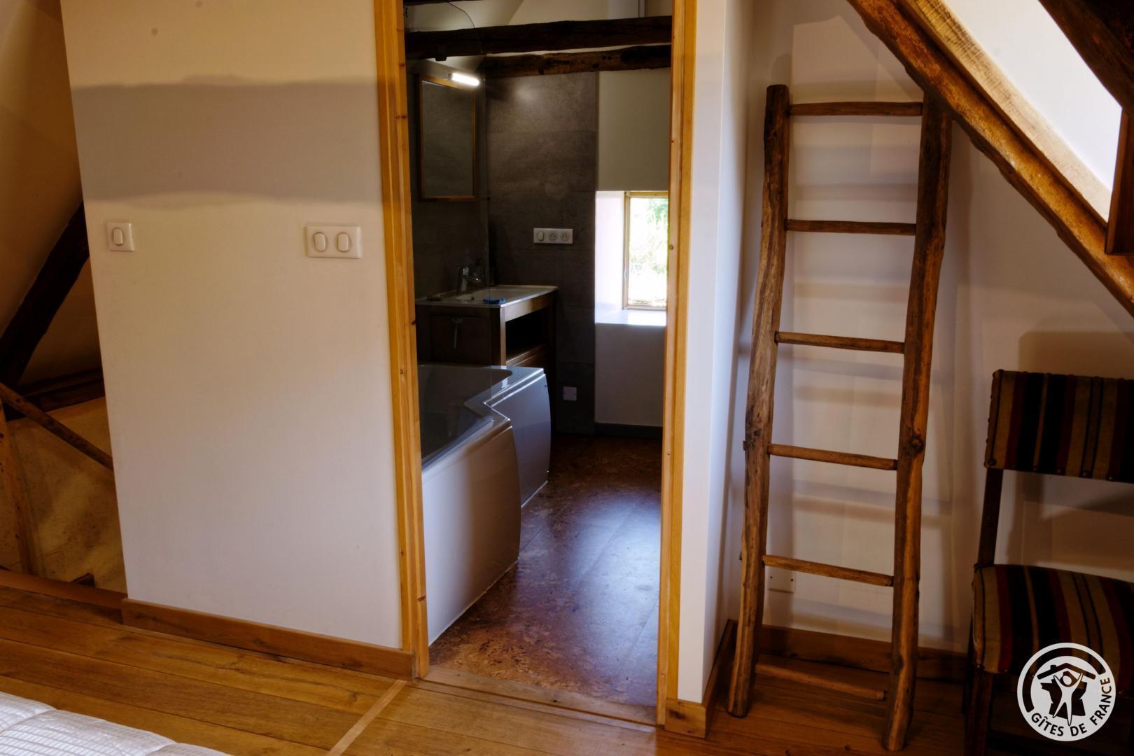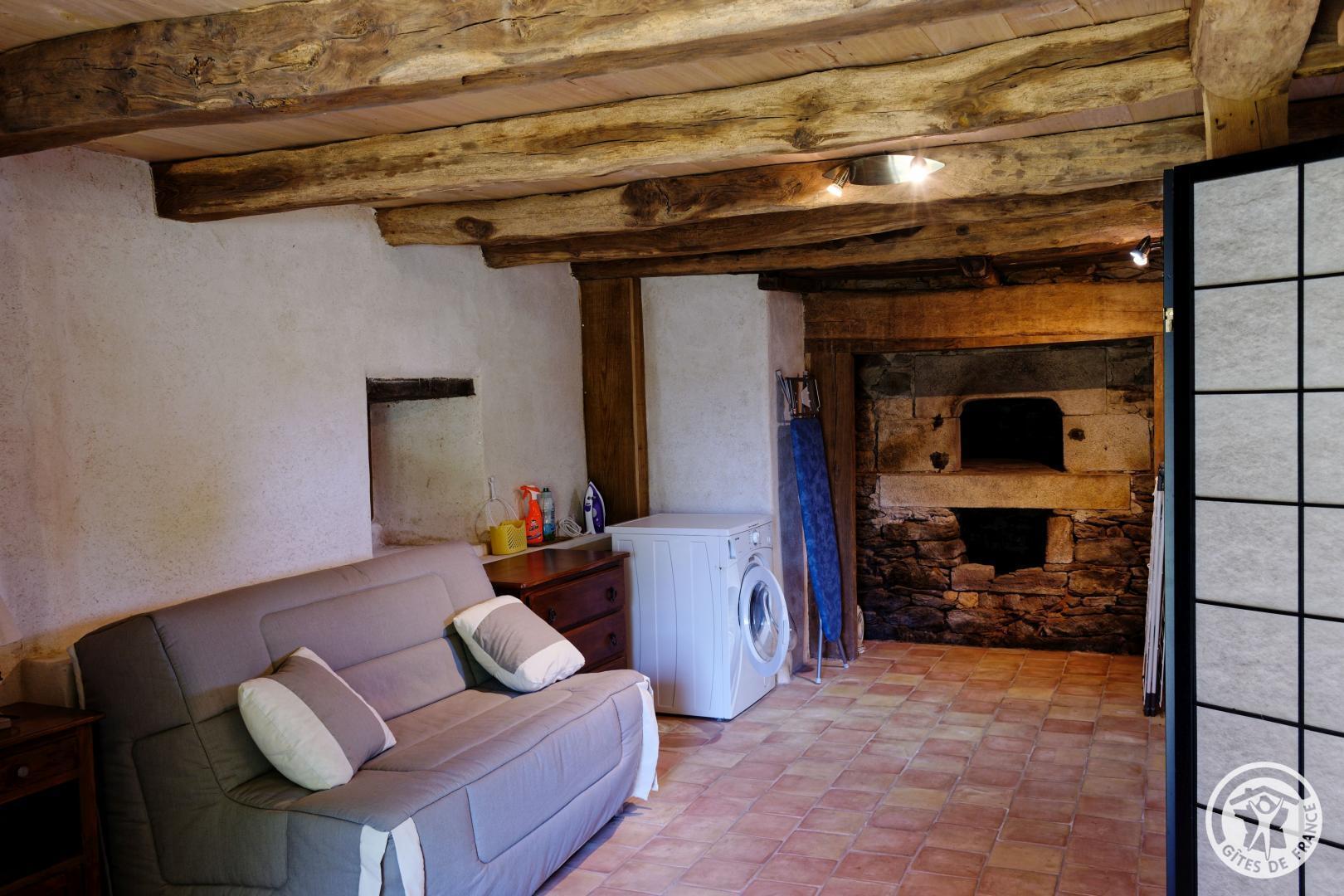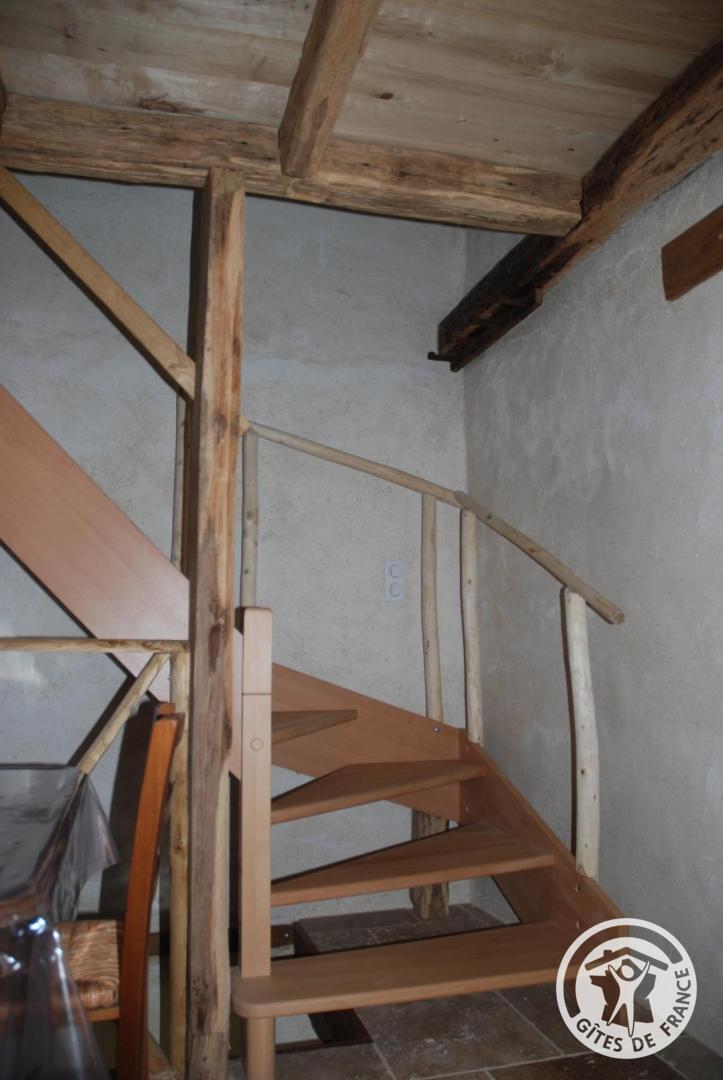 Une chambre avec un grand lit 2 personnes de 160 cm avec draps en lin fournis et une salle de bain baignoire-douche indépendante à l'étage avec baignoire et sol en liège, cuisine intégrée en noyer, entièrement équipée avec du matériel de qualité. Salon avec fauteuil confortable près du poêle, coin bureau, TV. Possibilité d'accueillir 2 couchages supplémentaires. Une très belle terrasse de +20m² surélevée en bois.